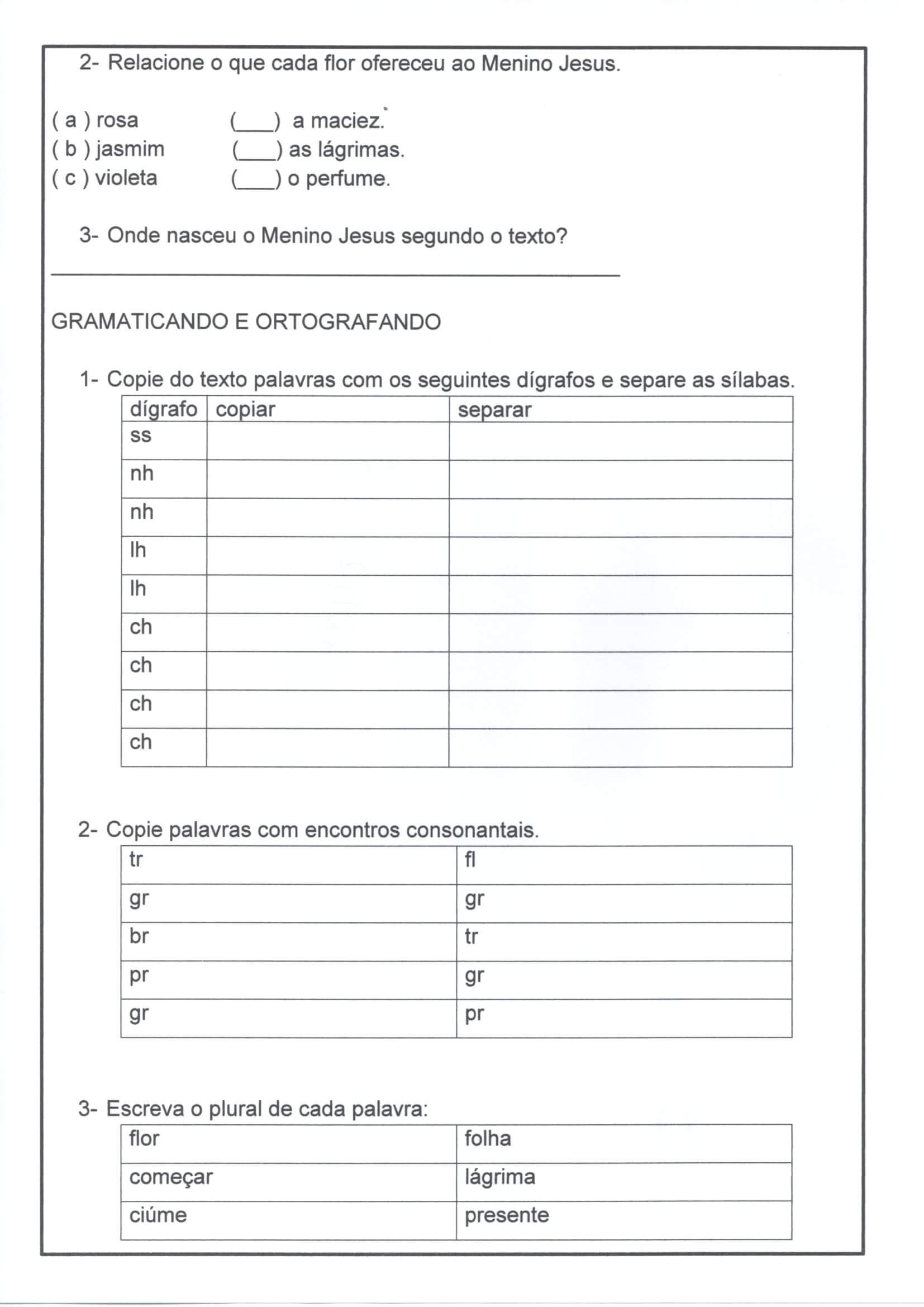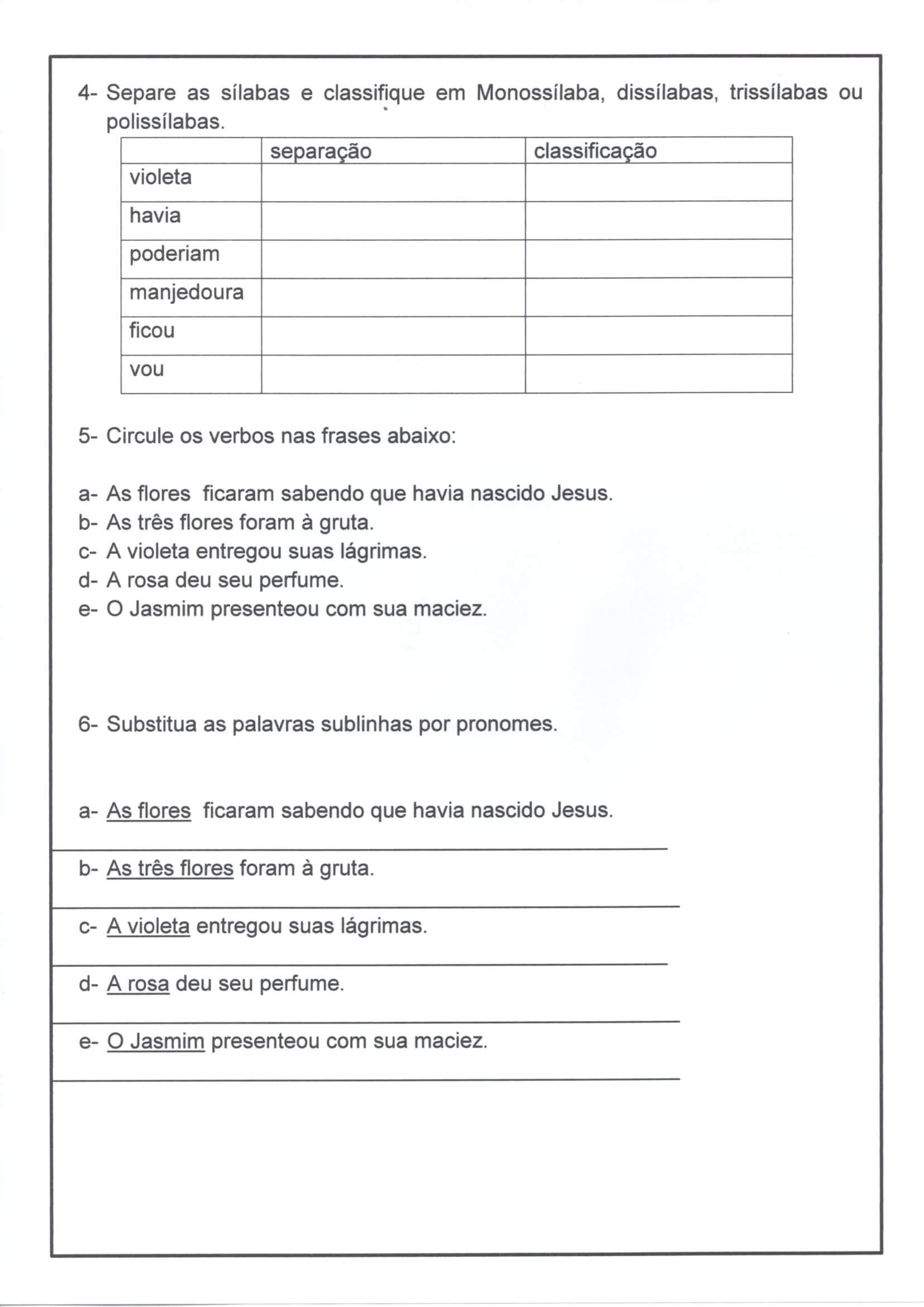 Atividade de Língua Portuguesa com Leitura, Interpretação, Dígrafos, Separação de sílabas e Classificação de sílabas, Encontros consonantais e Pronomes.