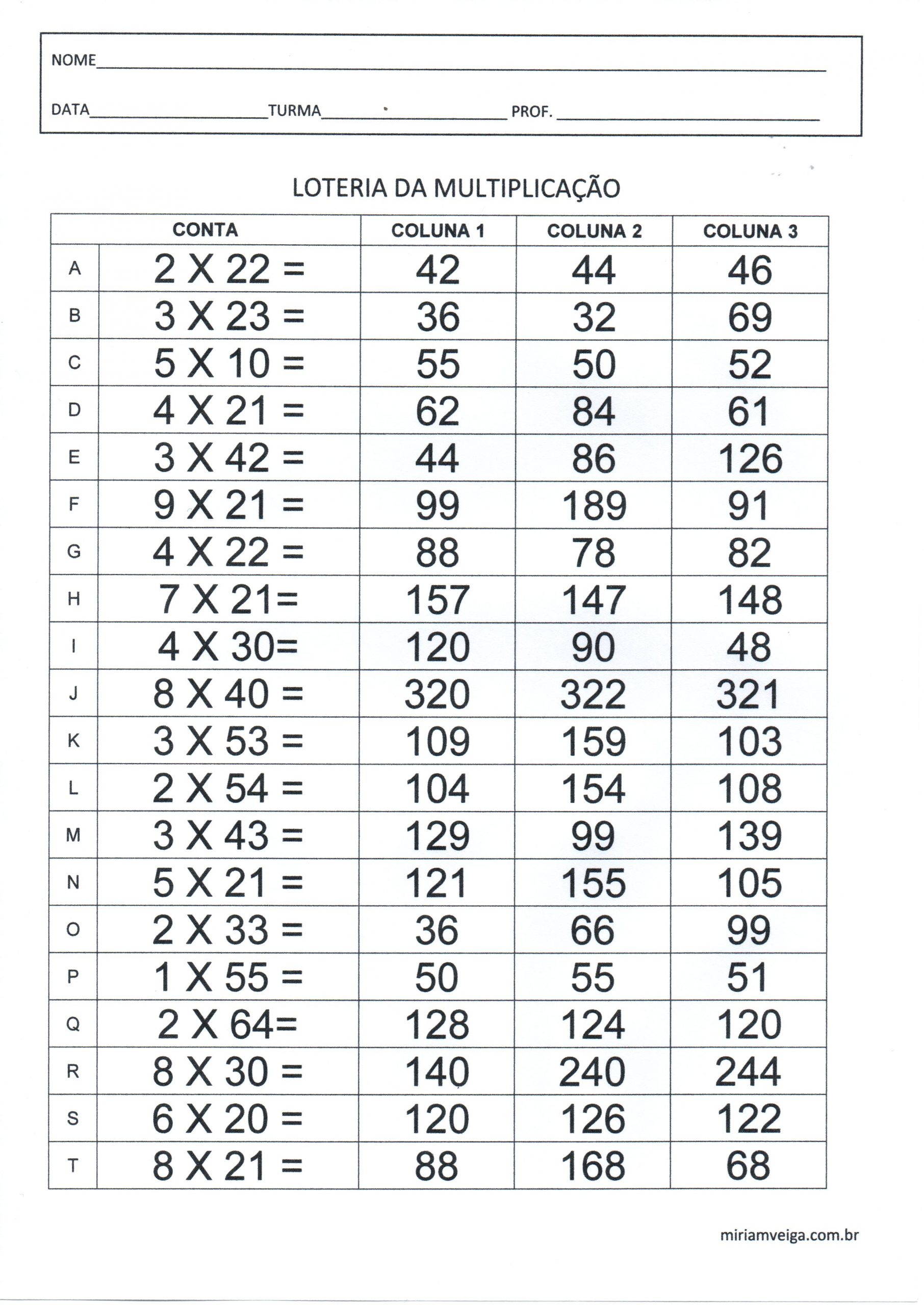 Atividade de Matemática-Loteria da Multiplicação é uma Atividade de matemática com contas de Multiplicação e a resposta em uma coluna para assinalar a opção correta.