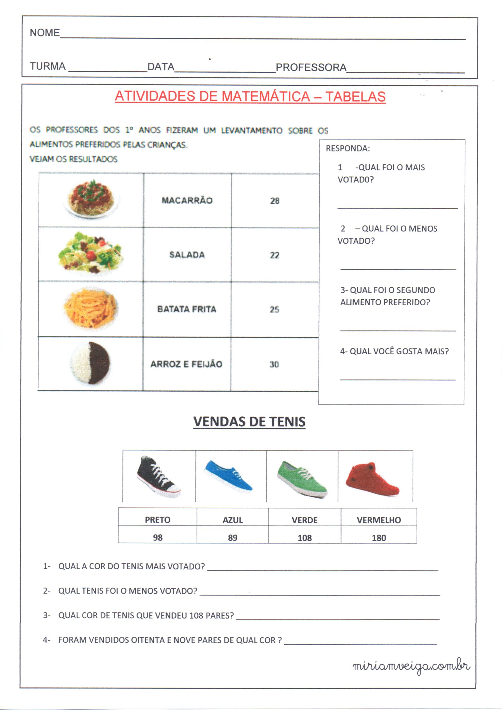Esta é uma atividade com GRÁFICOS e Tabelas para analisar os alimentos e os tênis preferidos pelas crianças.