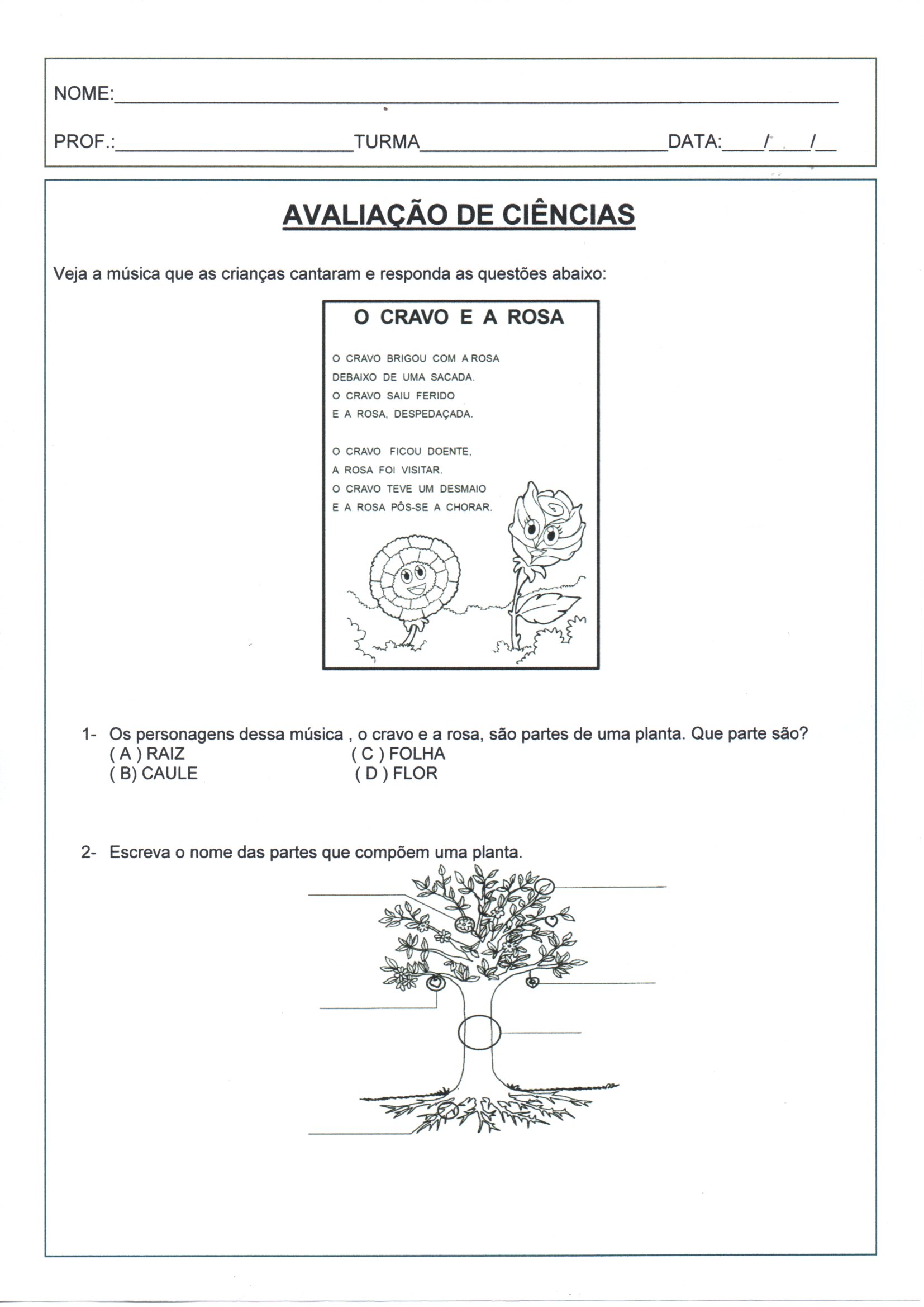 Avaliação de Ciências-Partes das plantas 1 é uma Atividade de Ciências com partes das plantas, seres vivos e não-vivos, necessidades e ciclos das plantas.