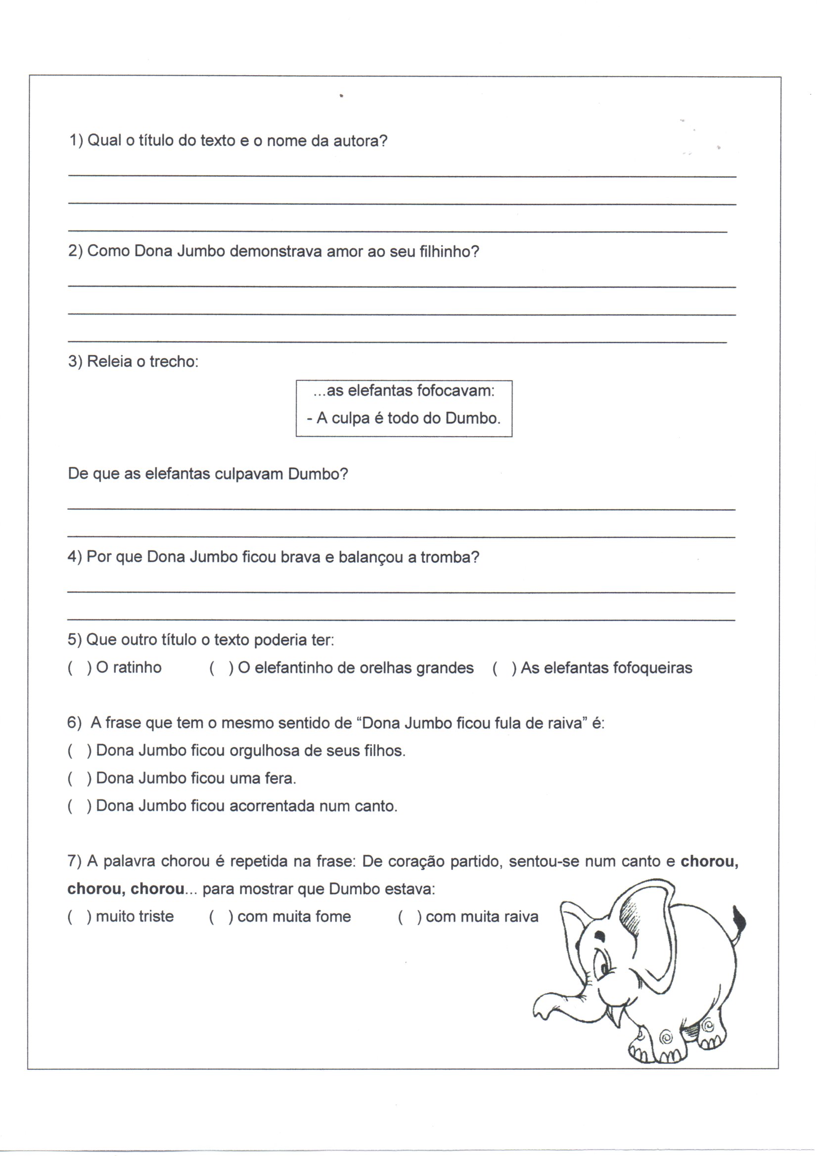 Avaliação de Língua Portuguesa Dumbo 2. Esta Avaliação de Língua Portuguesa trabalha com Leitura, Interpretação, Escrita, Gramática e Ortografia, plural, encontros vocálicos, pontuação.