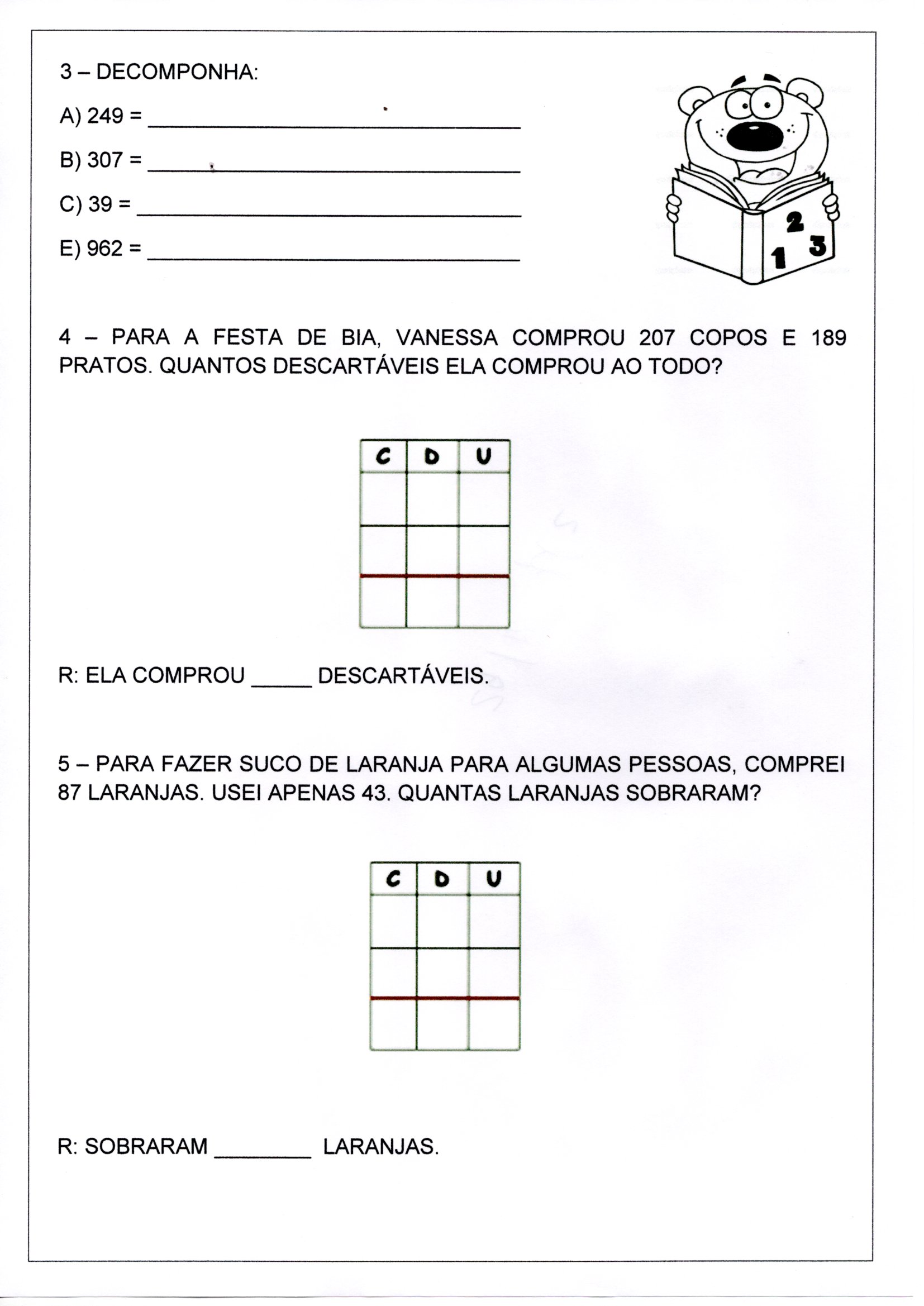 Avaliação de Matemática 4 Ano-Parte 2-Decomposição. Esta atividade permite fazer Avaliação de Matemática de 4º Ano do Ensino Fundamental, com contas de armar, depois calcular, números por escrito, decomposição, e CDU.