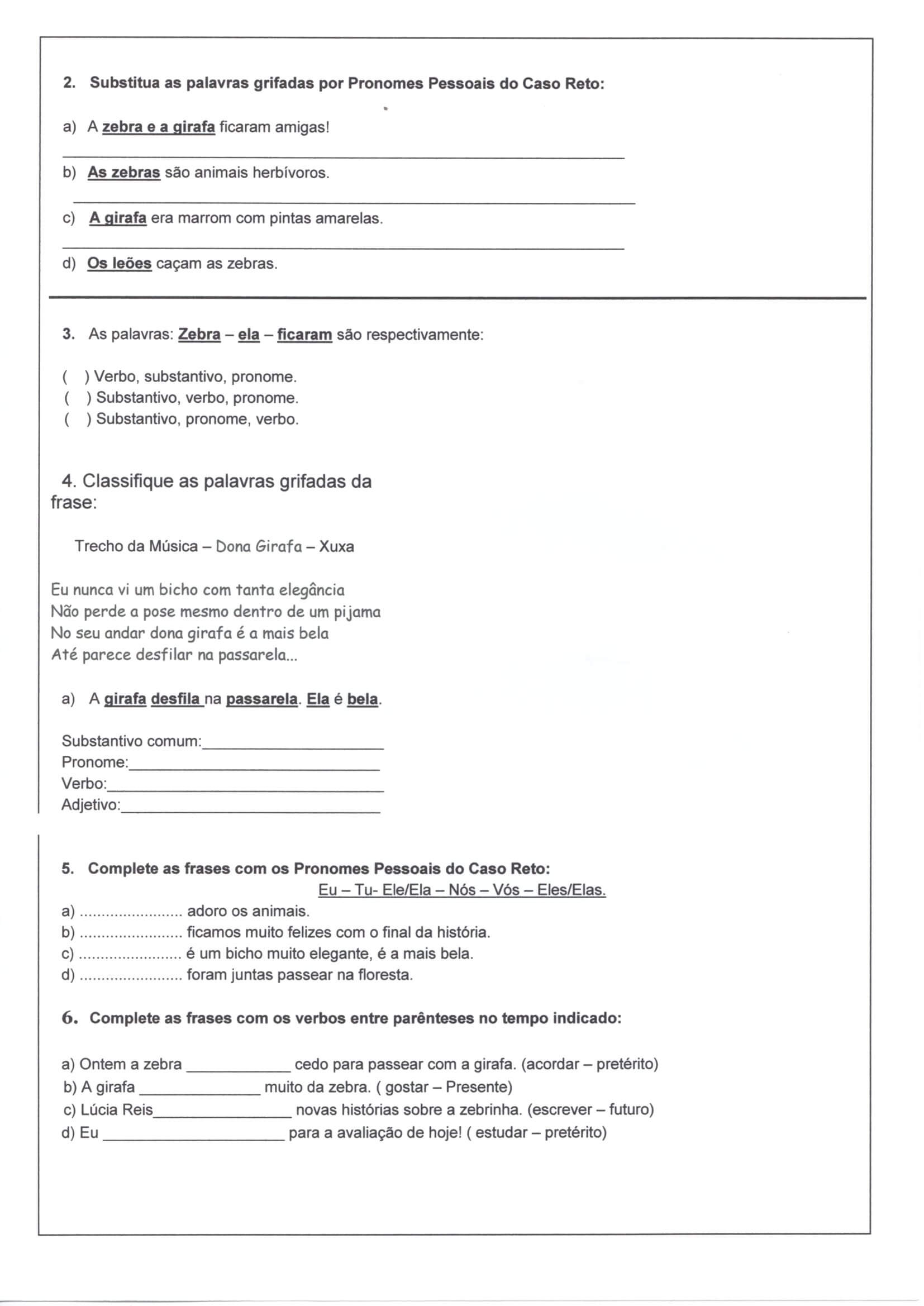 Avaliação com Leitura, Interpretação e Entendimento do texto, escrita, gramática, pronomes, verbos e substantivos.
