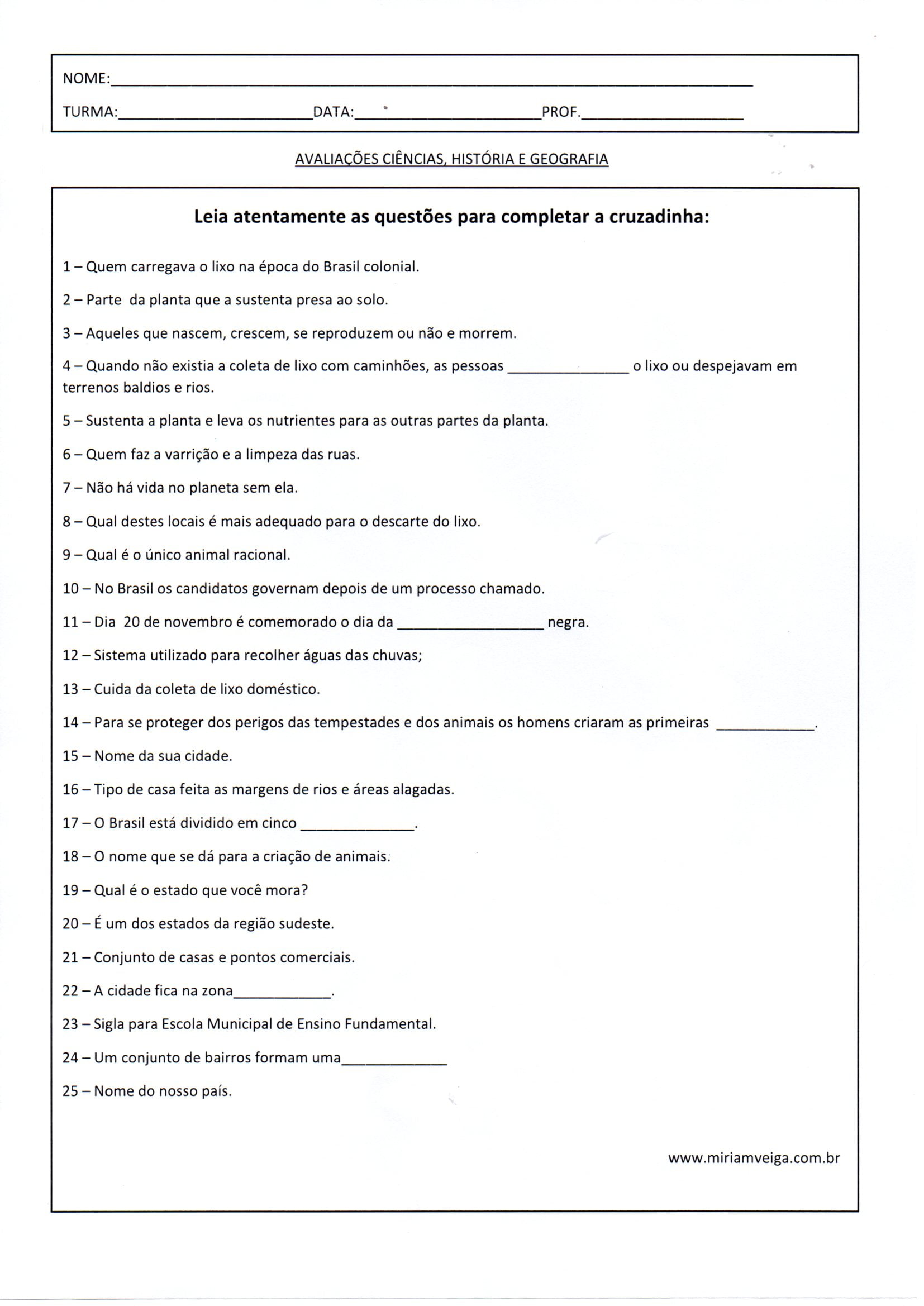 Avaliação Geral 3 Trimestre 8-Ciências 2 Questões da Cruzadinha é uma Avaliação de Língua Portuguesa, Matemática, Geografia, História e Ciências com Capa, texto para interpretação, pontuação, contas, CDU, tempo, problemas e questões.