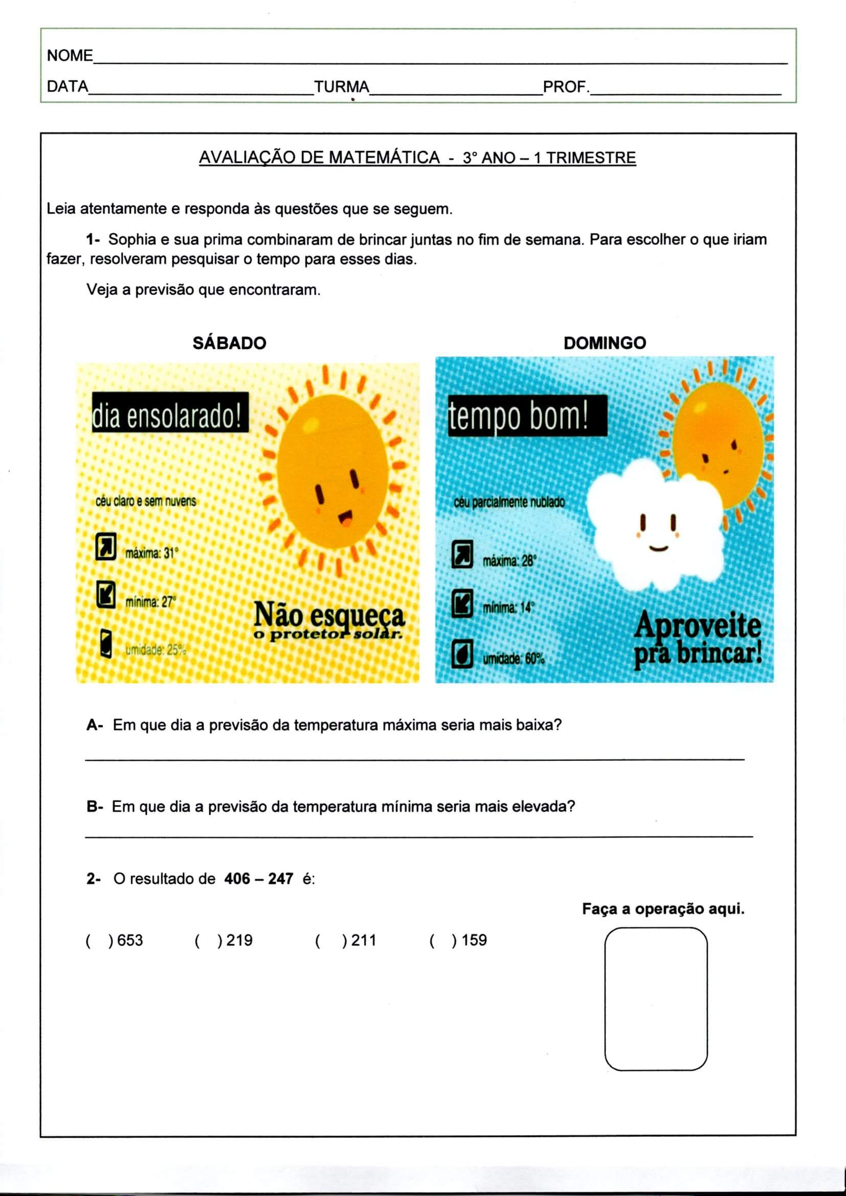 Avaliação de Matemática 3 Ano-1 Trimestre-Parte 2. Avaliação de Matemática com Clima, Adição, Subtração, Crescente, Decrescente, Antecessor e Sucessor, Unidade.