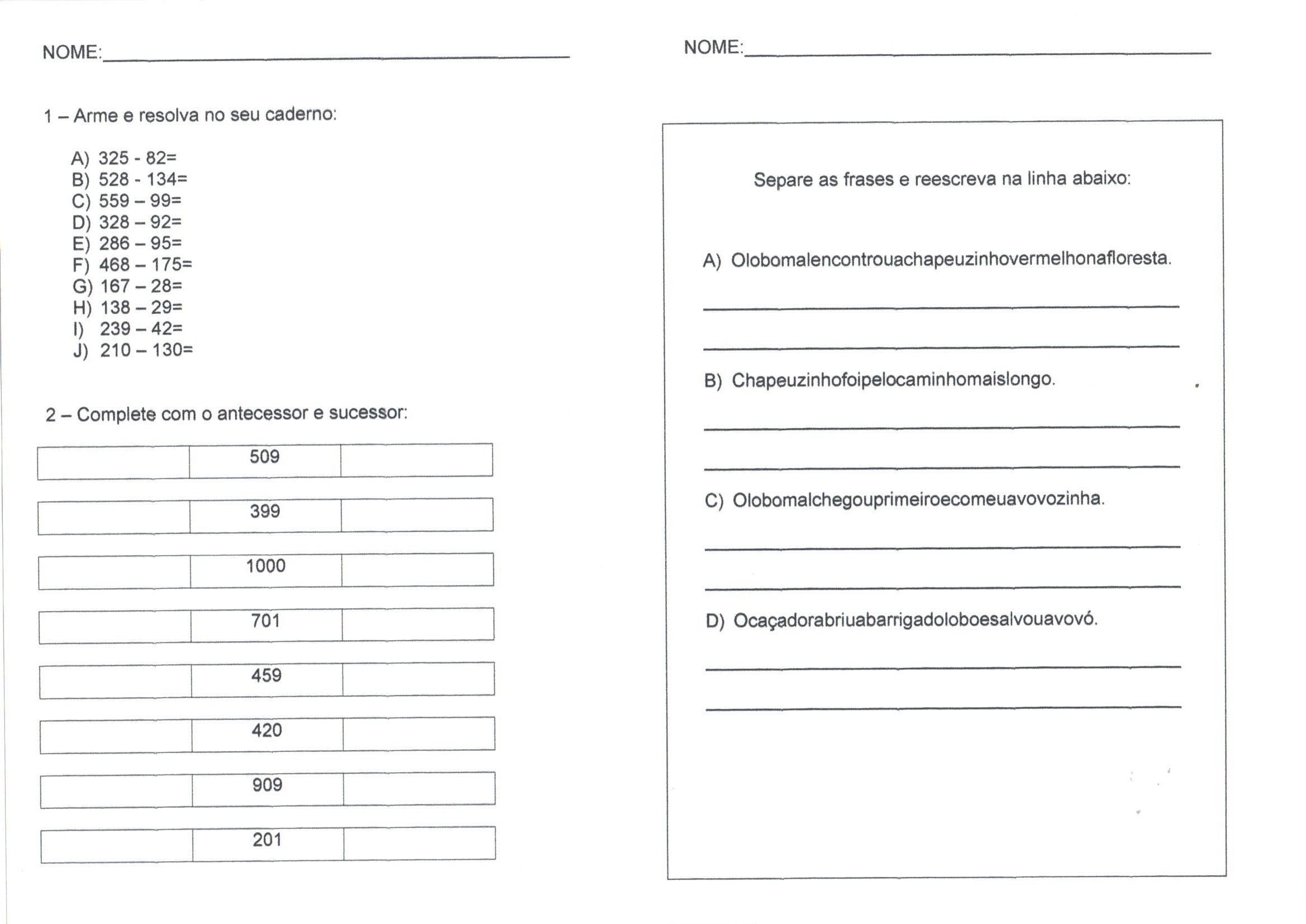 …Antecessor-Sucessor e Segmentação de palavras é uma Atividade de Matemática com continhas para armar, quadro de antecessor e sucessor para preencher e exercícios de segmentação de palavras.