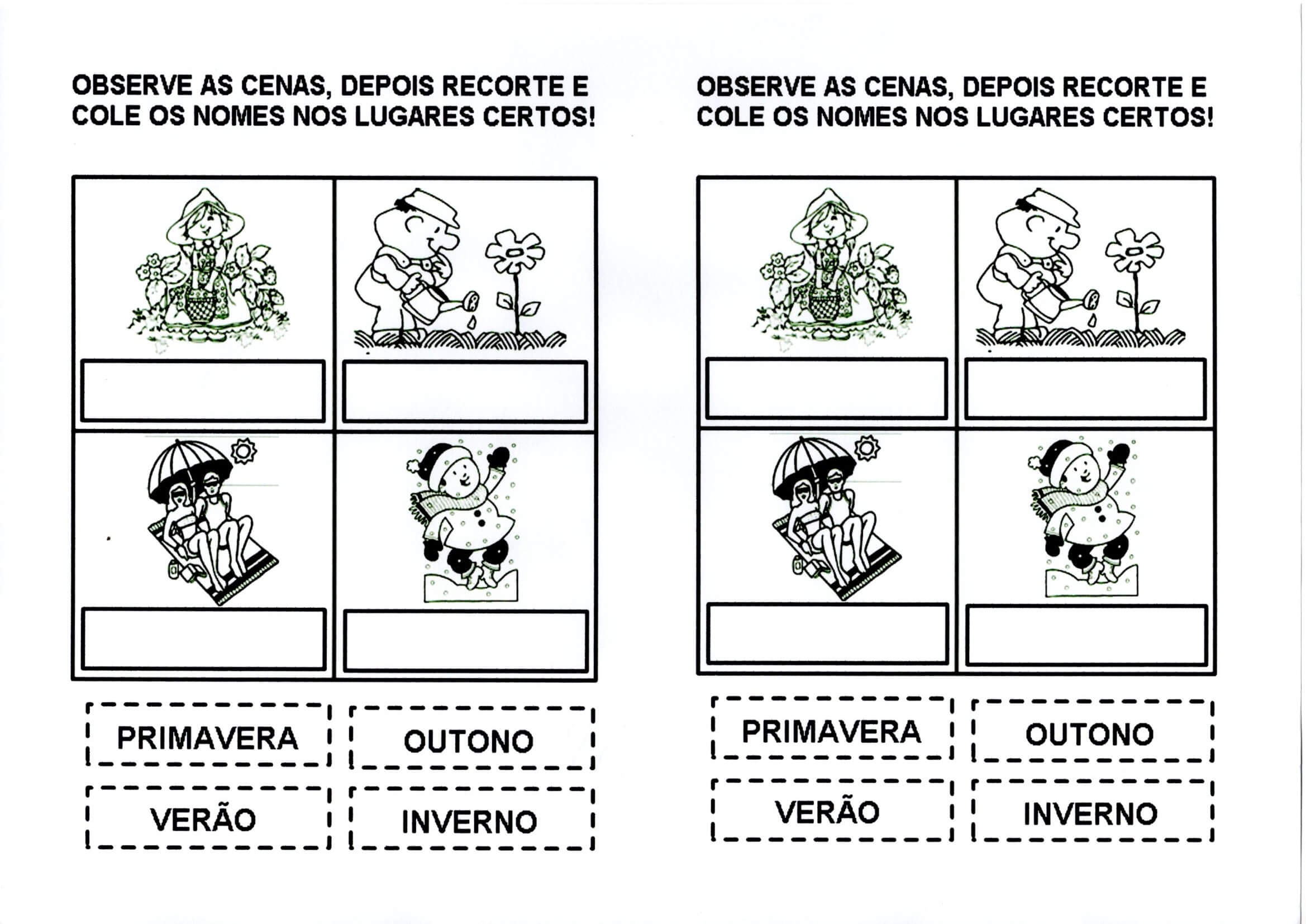 As estações do ano-Recorte Cole e Desenhe. Atividade com as Estações do ano com Recorte e Cole os nomes nos lugares certos e depois Desenhe o que se pede para cada fase.