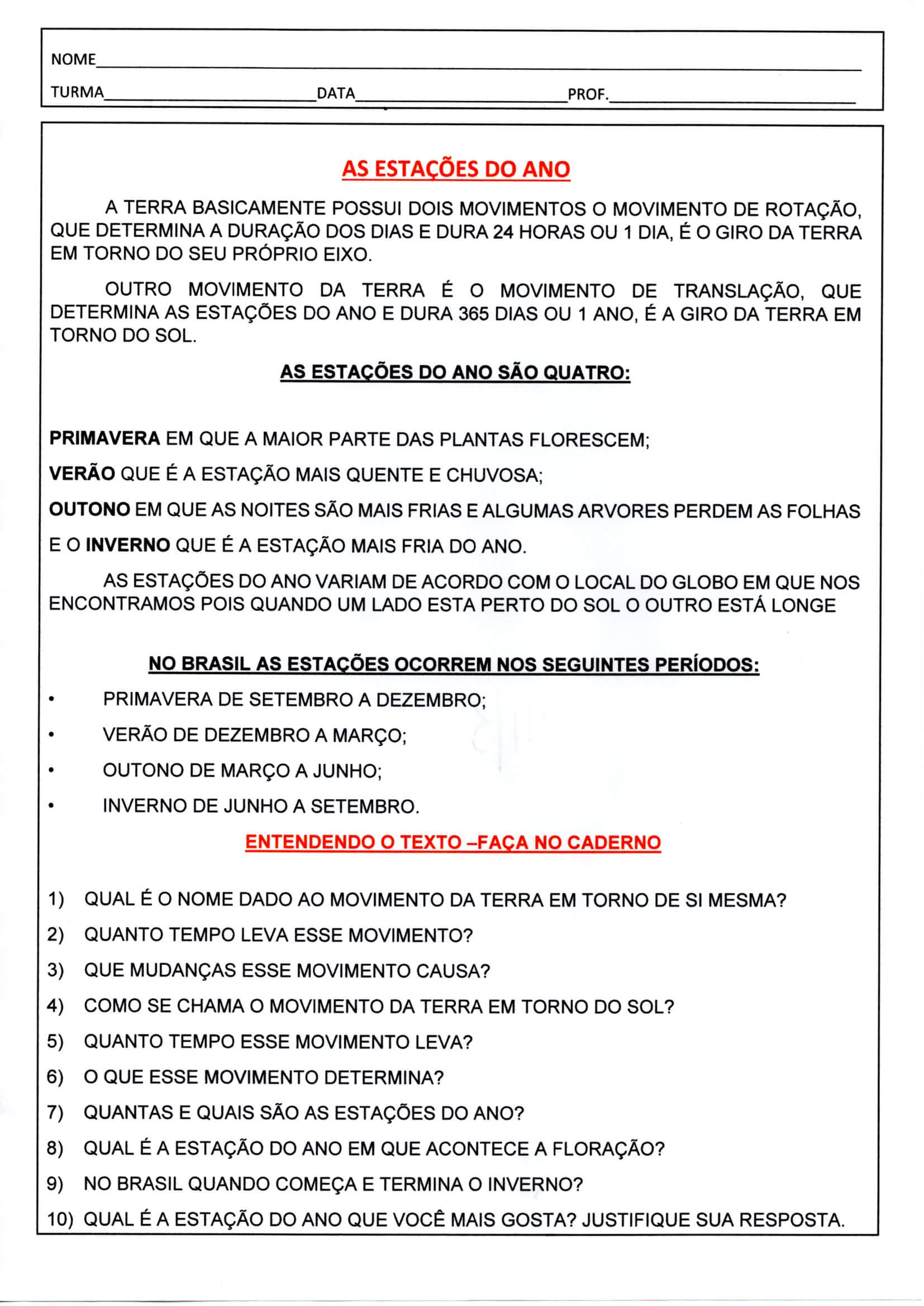 As estações do ano-Texto e Interpretação. Atividade com as Estações do ano com Texto explicativo para interpretação e questões para copiar no caderno.