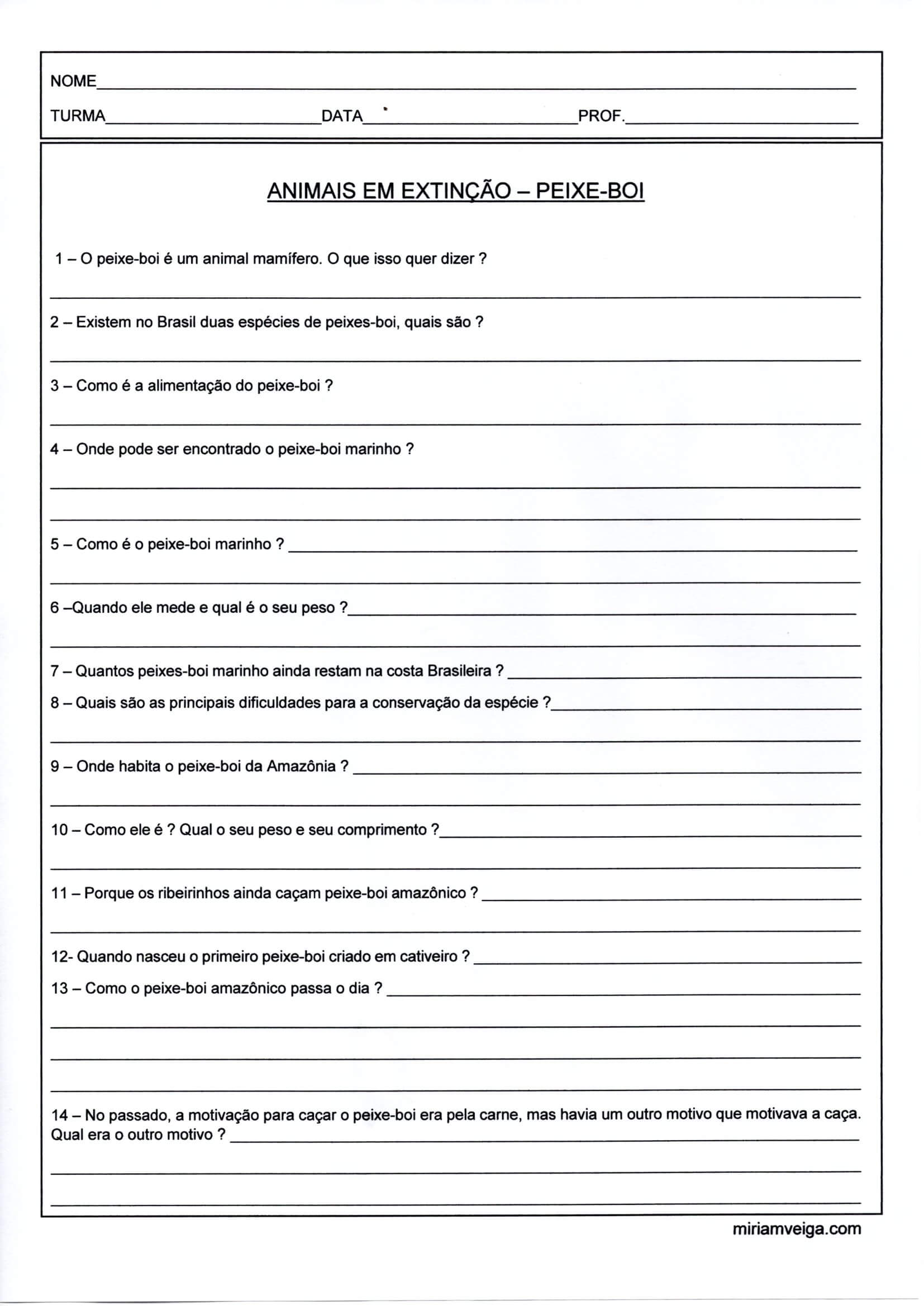 Animais em extinção-Peixe-boi-Questionário. Nesta atividade dividida em 2 partes com o Tema Animais em extinção o aluno poderá conhecer o Peixe-boi e suas características, além de responder a um questionário com 14 perguntas.