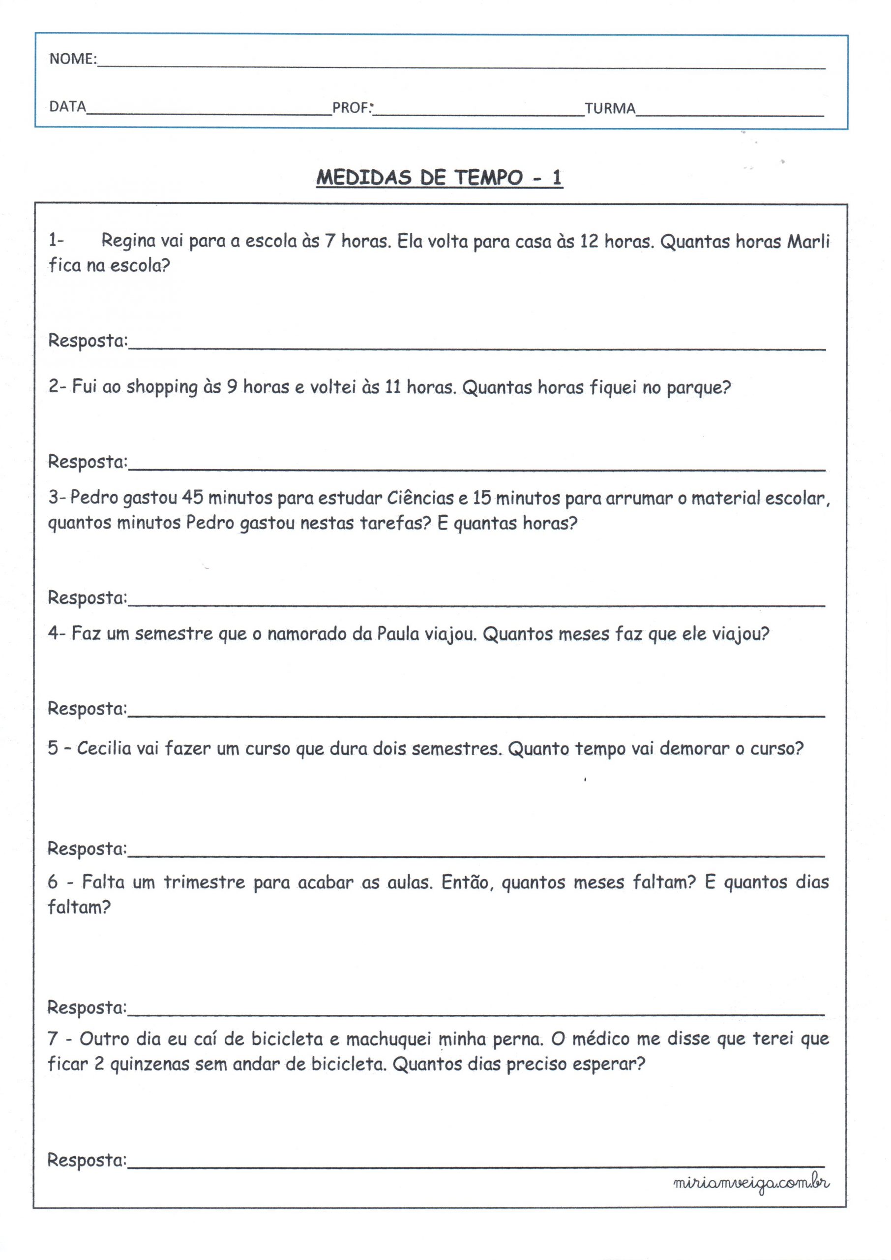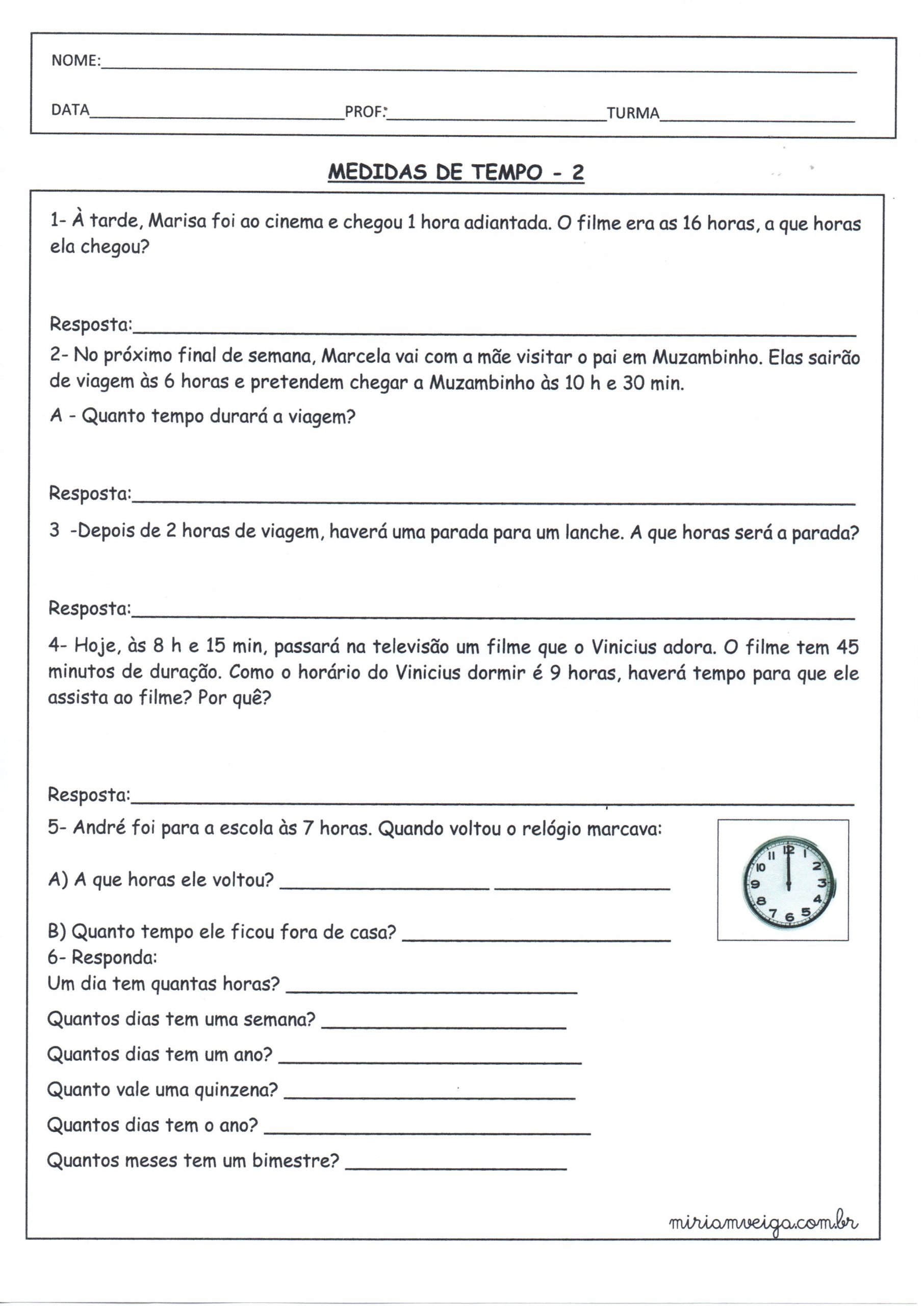 …Problemas de Medidas de Tempo-Parte 2 é uma atividade com problemas de medidas de tempo com questões para resolução sobre hora, dia, quinzena, mês, bimestre, trimestre e ano.