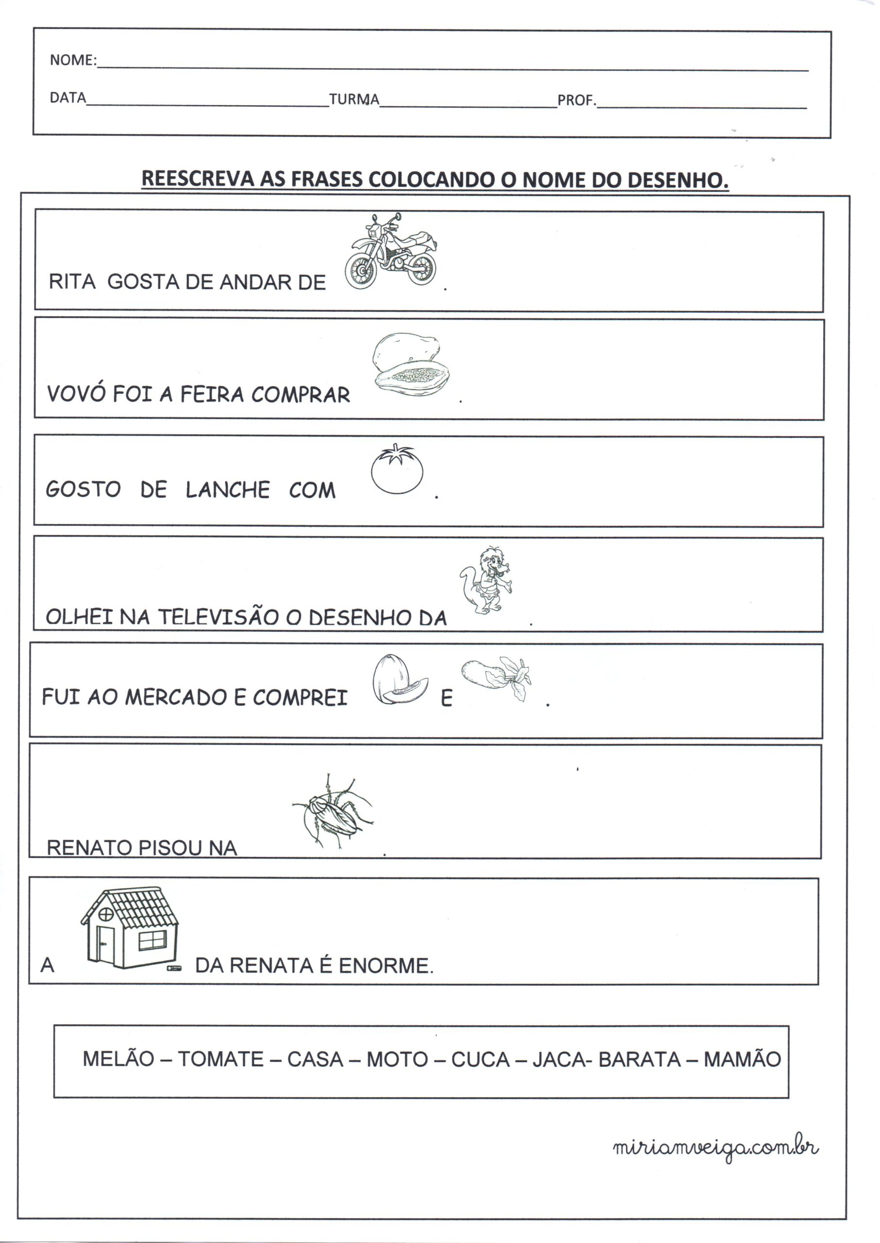 …Reescreva as frases colocando o nome dos desenhos é uma Atividade de Língua Portuguesa na qual o aluno deve reescrever as frases colocando o nome dos desenhos.