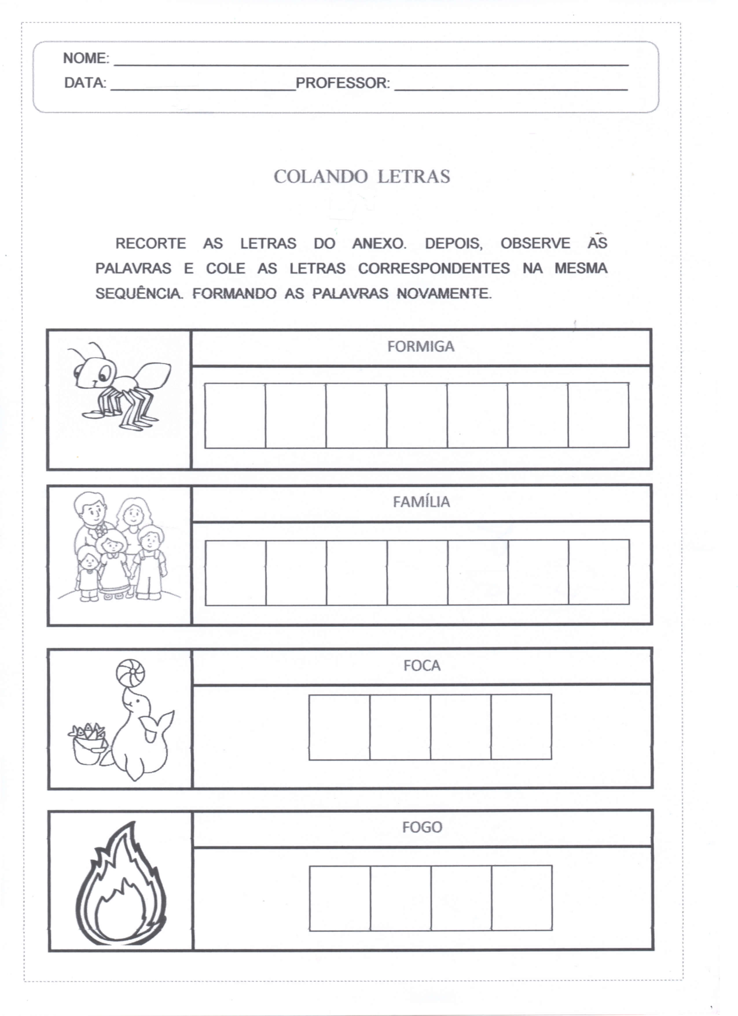Atividade Colando Letras. Atividade de Língua Portuguesa. Recortar as letras e formar nomes. Esta atividade tem duas folhas.