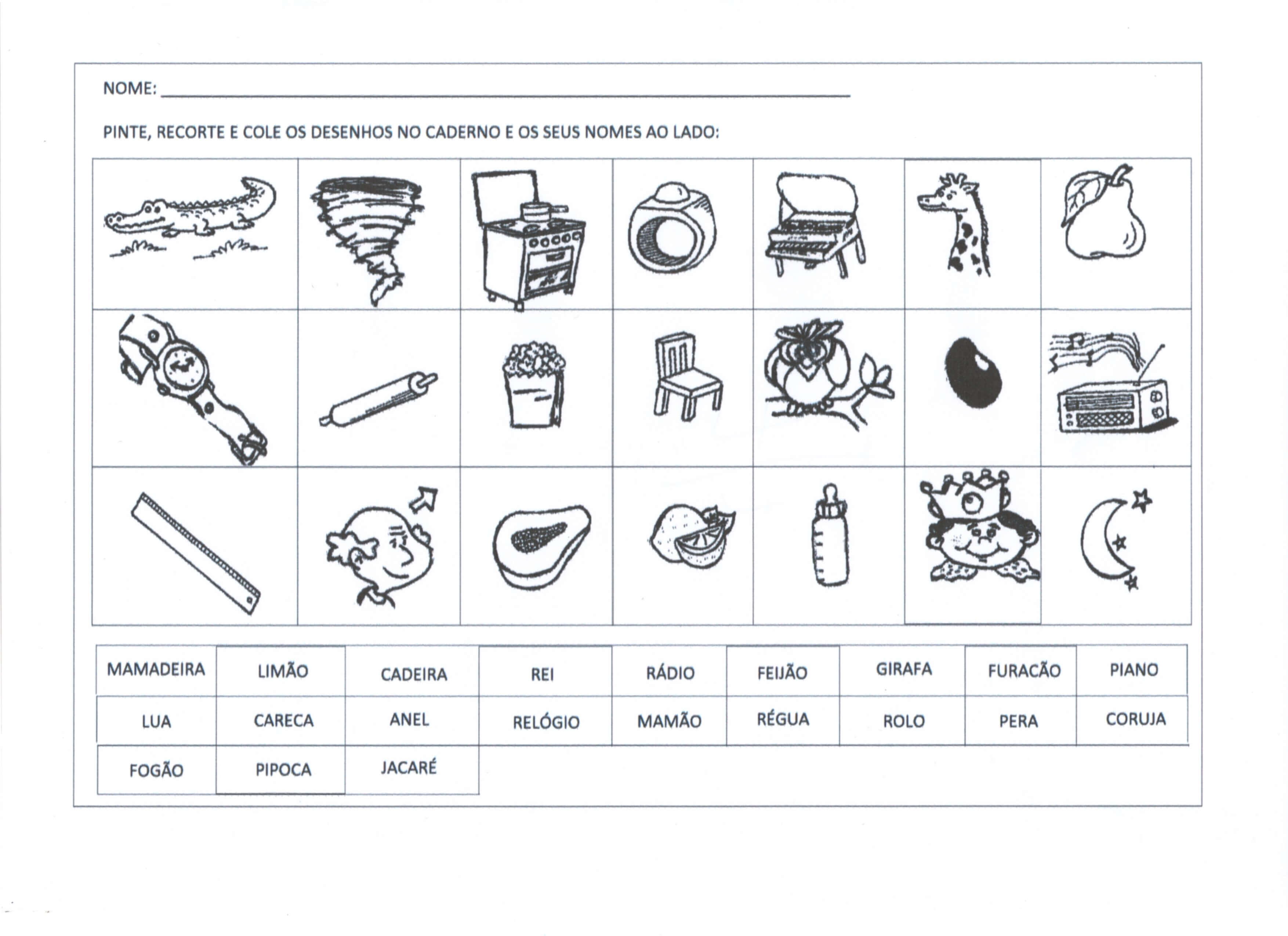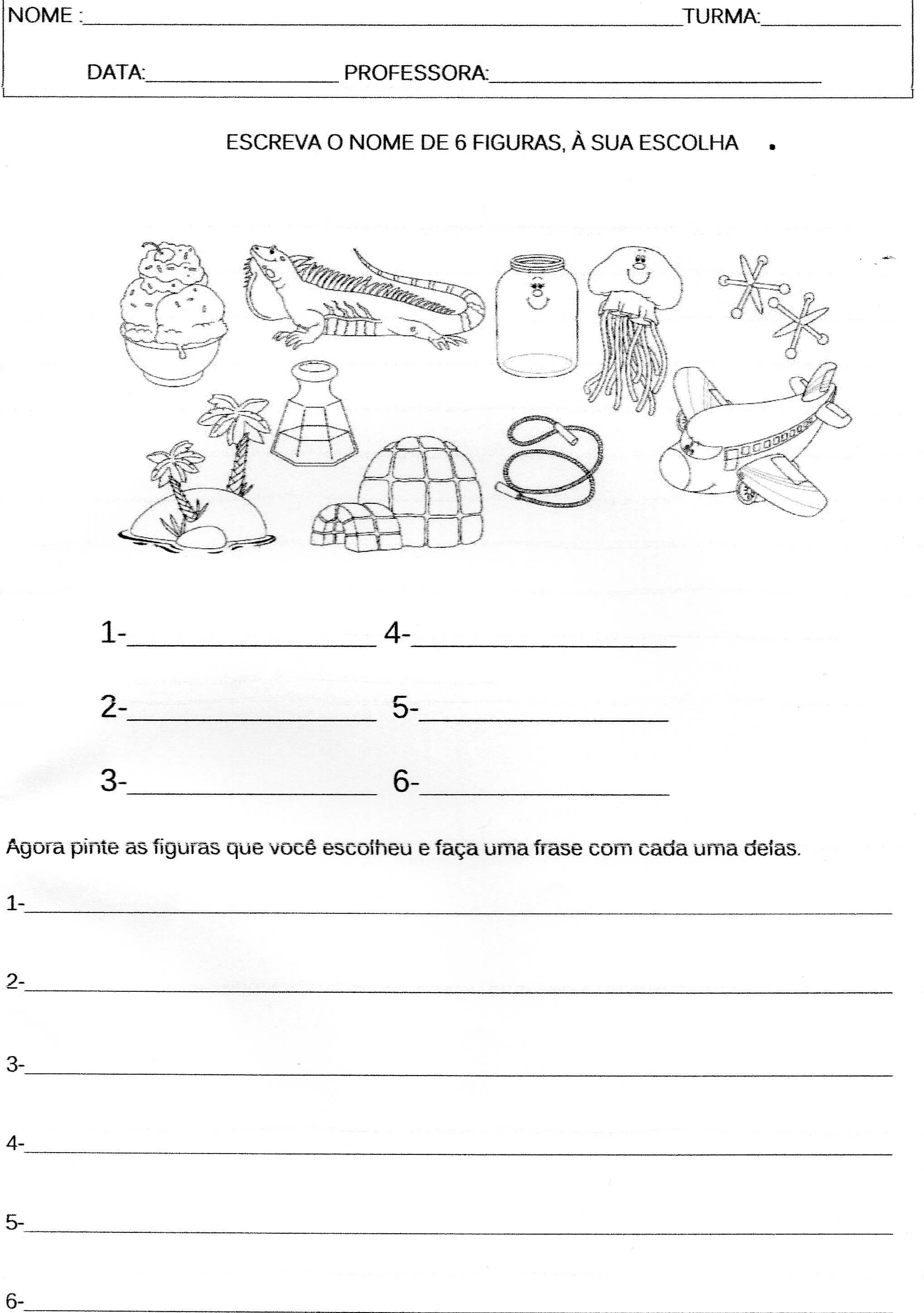 Escrever o nome das figuras pintar escrever frases. Atividade de Ensino Fundamental pronta para imprimir, recortar e usar.