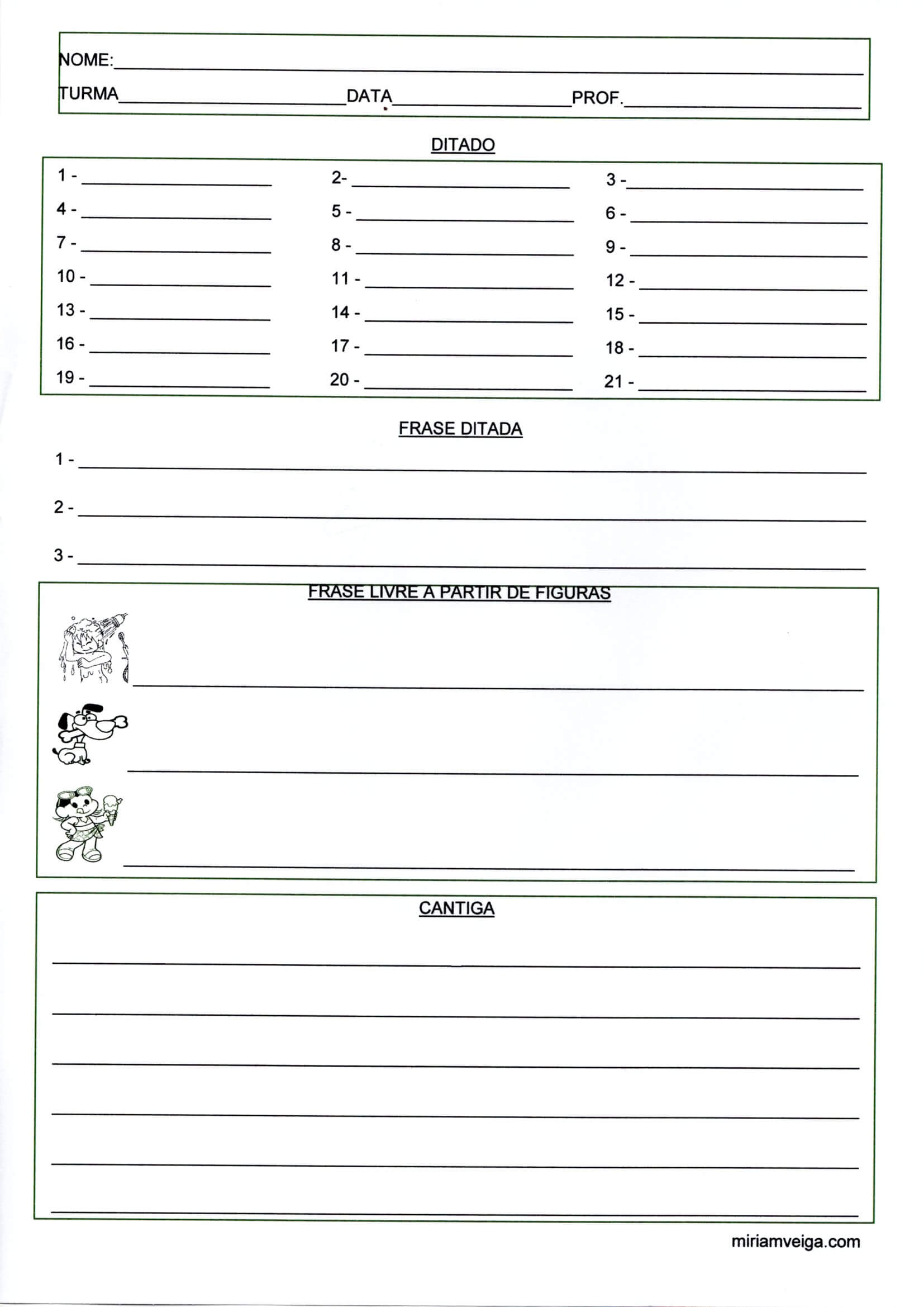 Avaliação 1 e 2 Ano-Ditado Frase e Cantiga. Esta atividade trabalha com Ditado, Frases livres a partir de figuras e escrita de Cantiga.