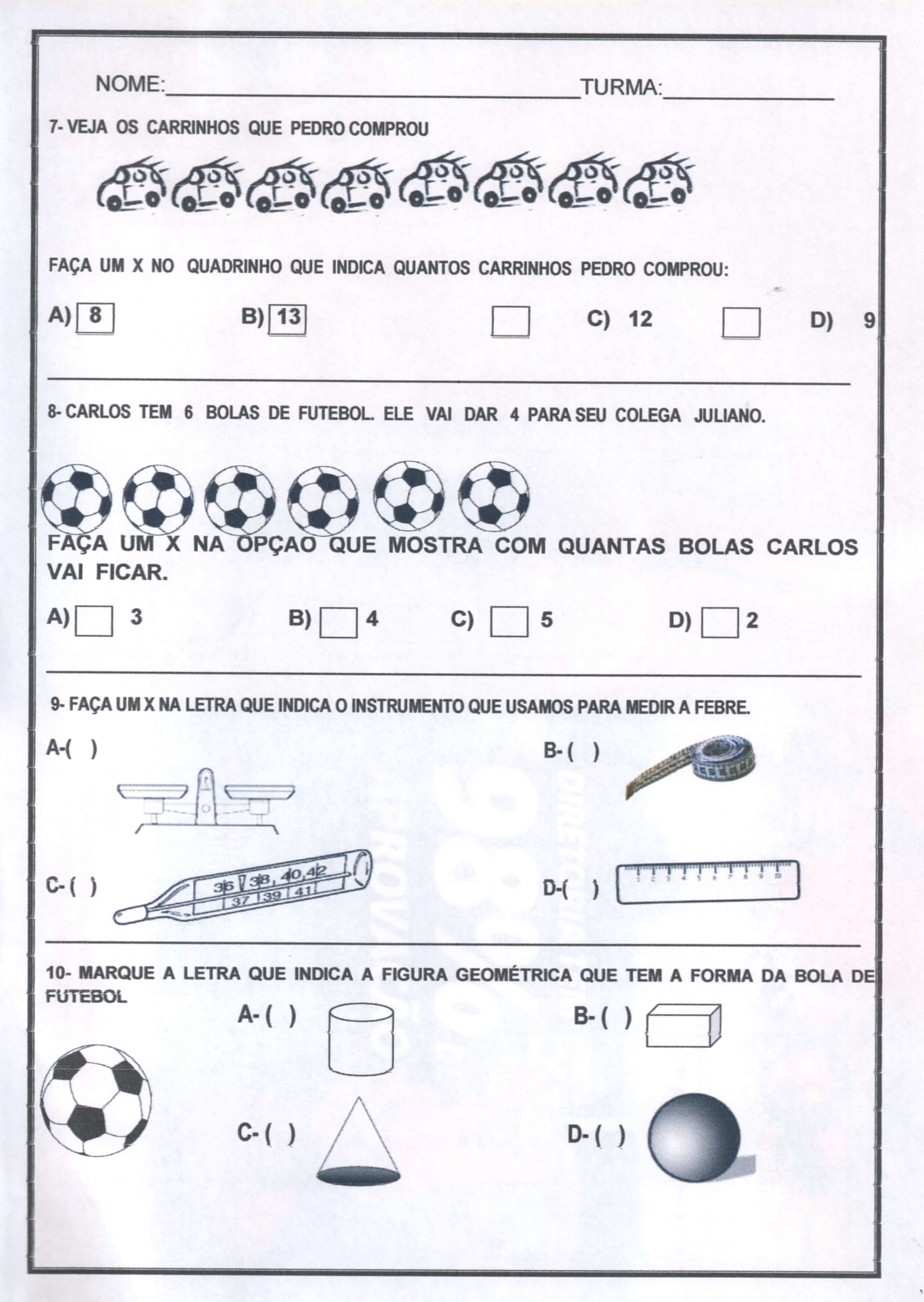 Avaliação Diagnóstica do 1 Ano-Matemática Folha 6. Esta atividade tem 6 folhas, esta é a número 6.