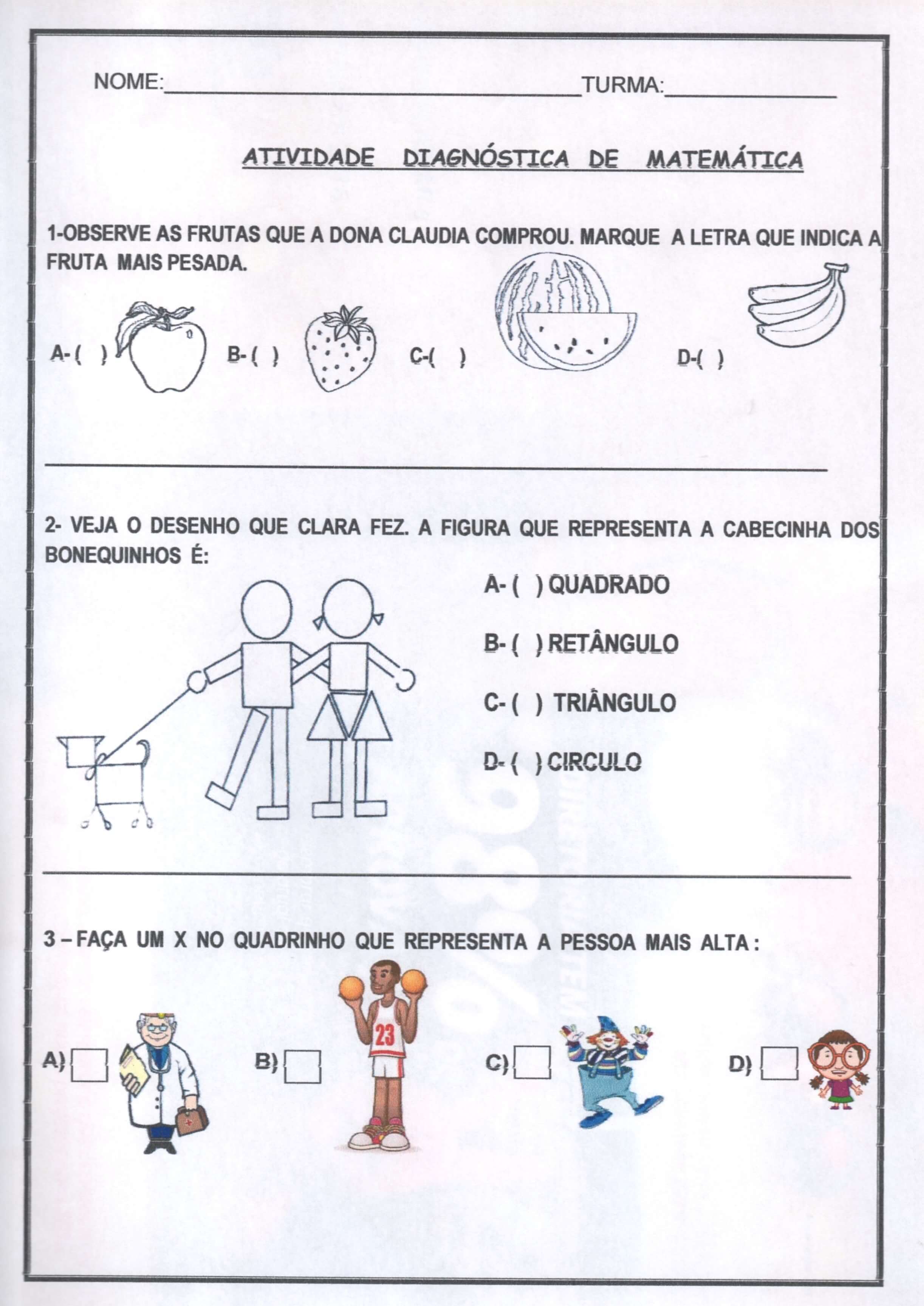 Avaliação Diagnóstica do 1º Ano – Matemática Folhas 4 e 5. Esta atividade tem 6 folhas, esta postagem tem a 4 e a 5. Avaliação Diagnóstica do Ensino Fundamental Grátis.