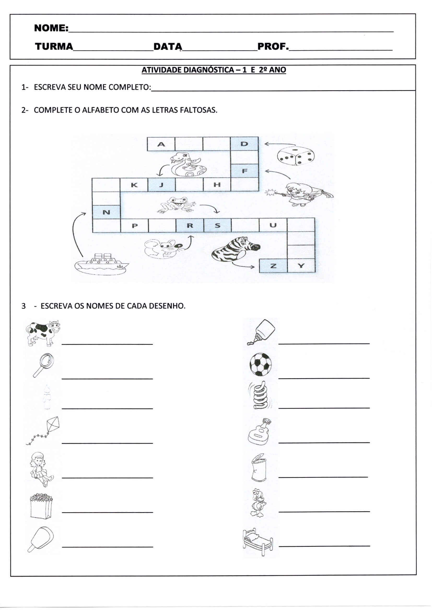 Avaliação Diagnóstica/Inicial de alunos de 2º Ano do Ensino Fundamental-Folha 1