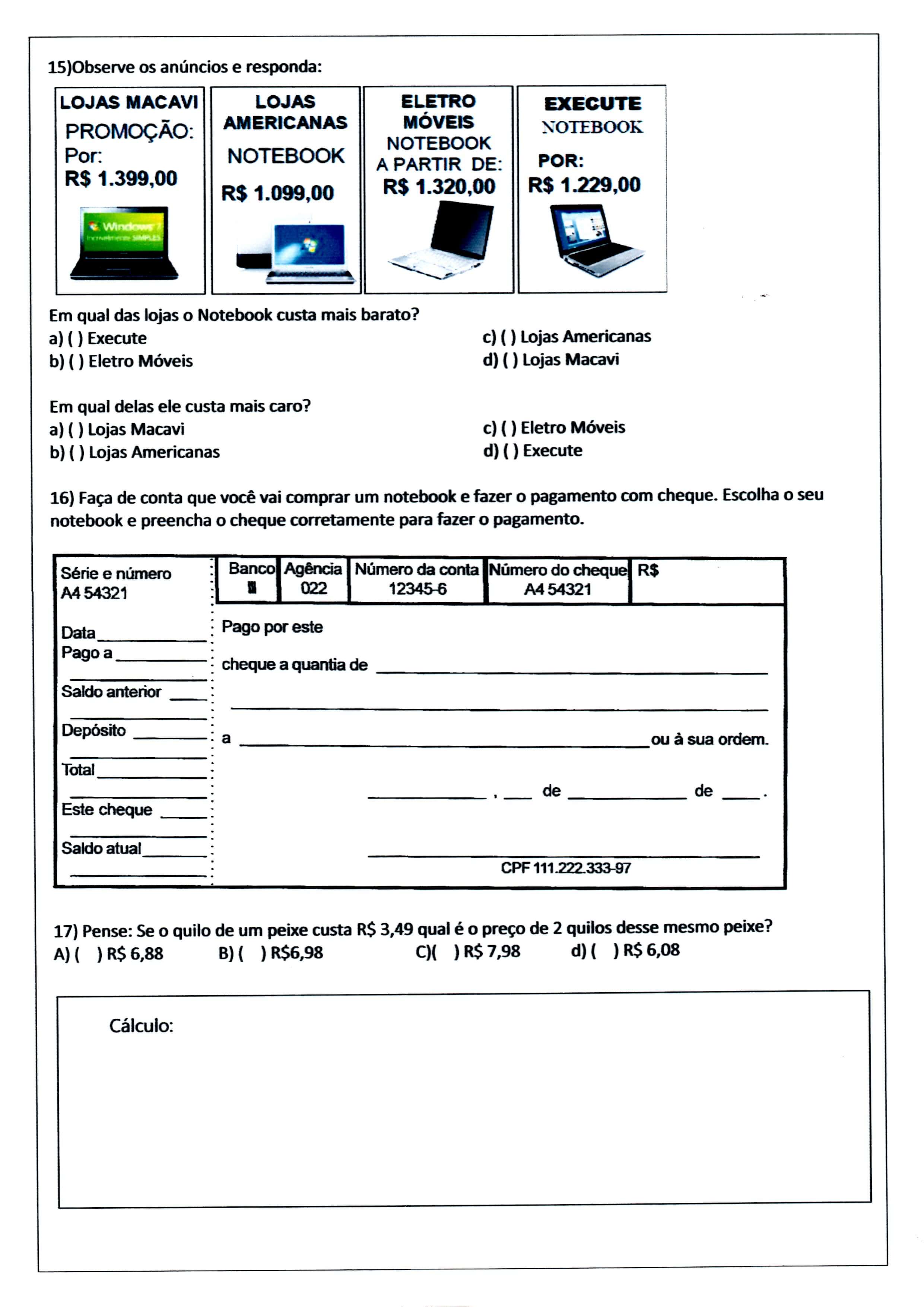 Avaliação de Matemática – 3º ANO Ensino Fundamental – Parte 3