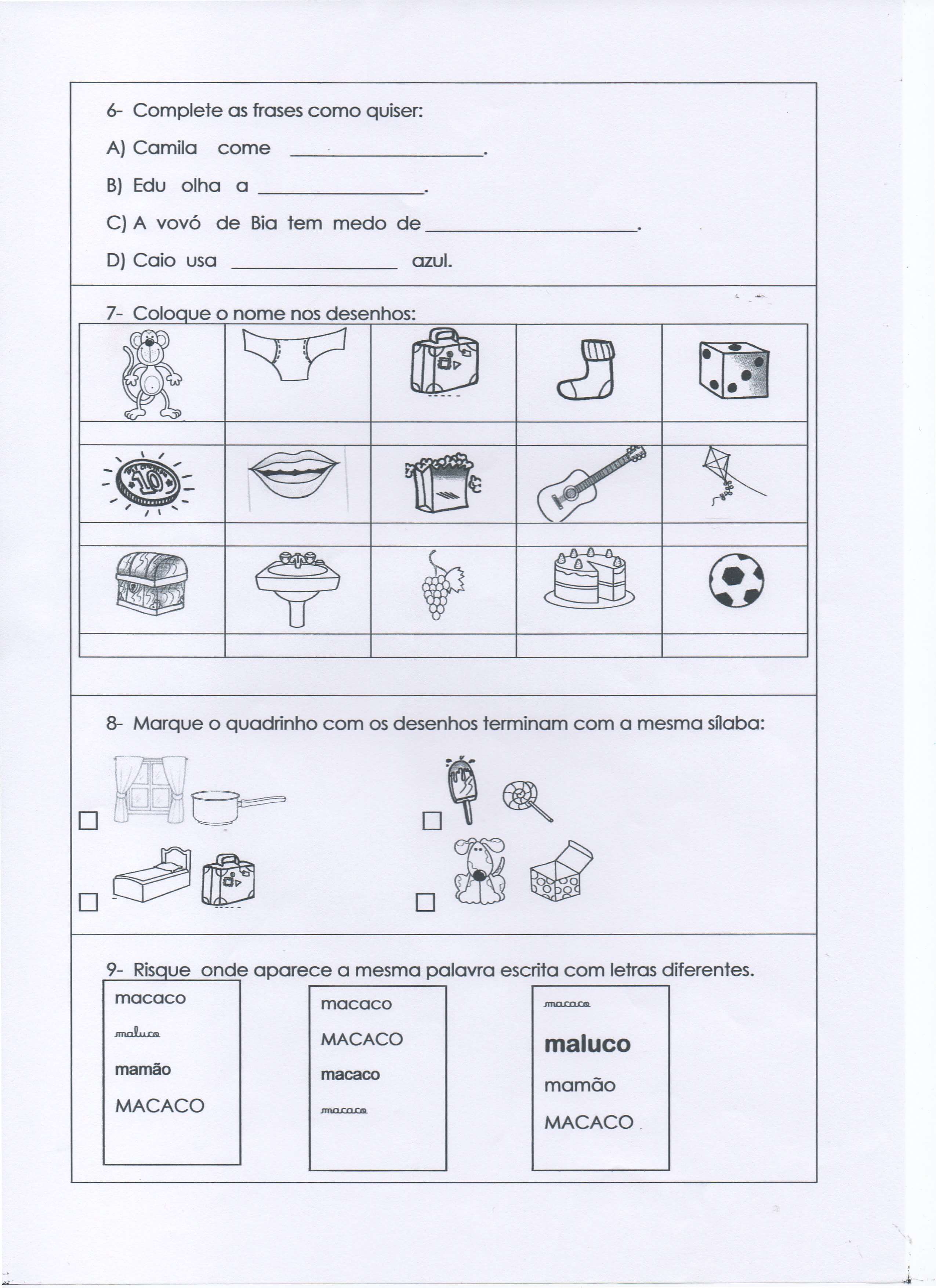 Desenhos com sílabas para montar K e Z
