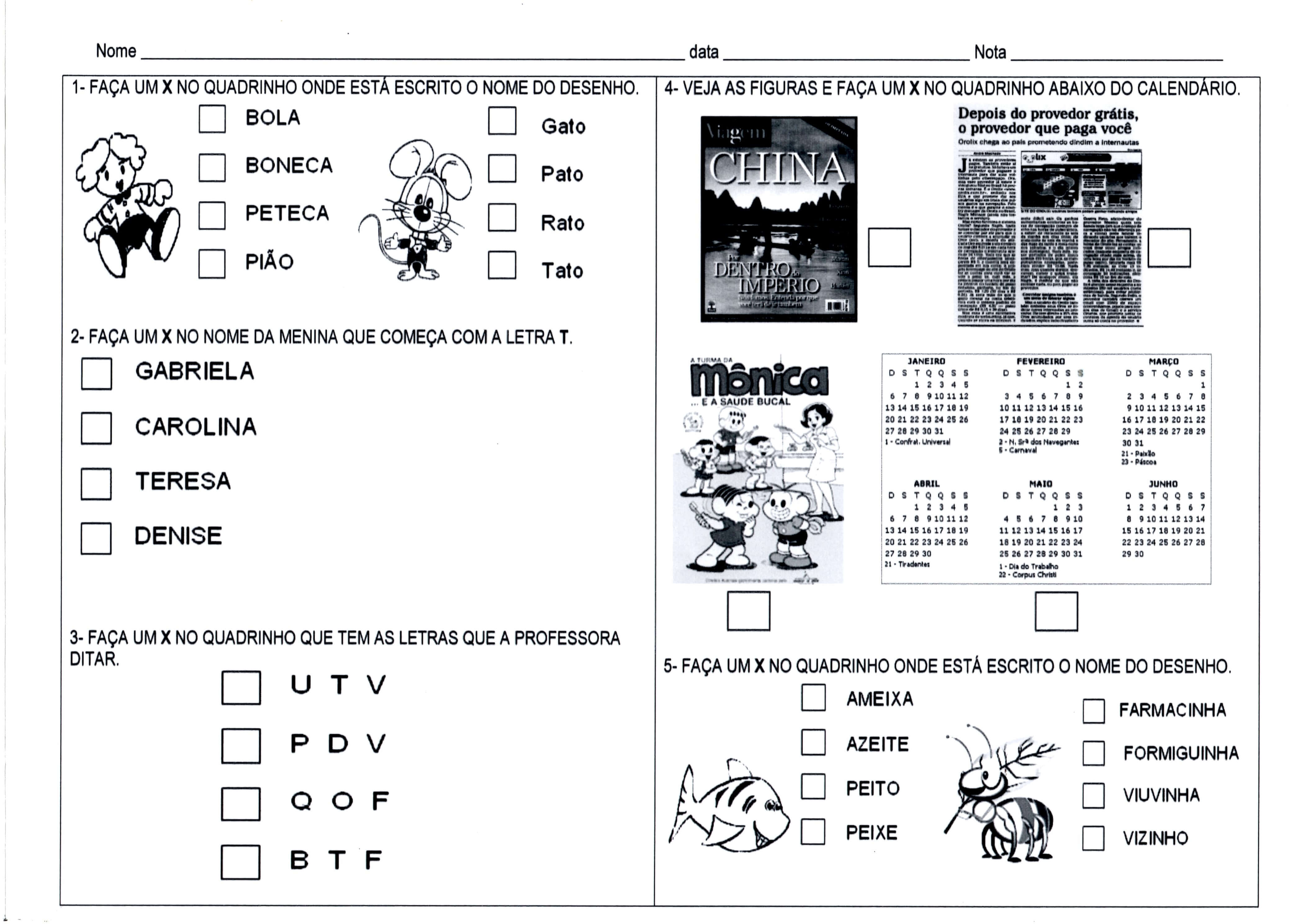 Avaliação de 1º ANO de Ensino Fundamental – Parte 1 de 3.