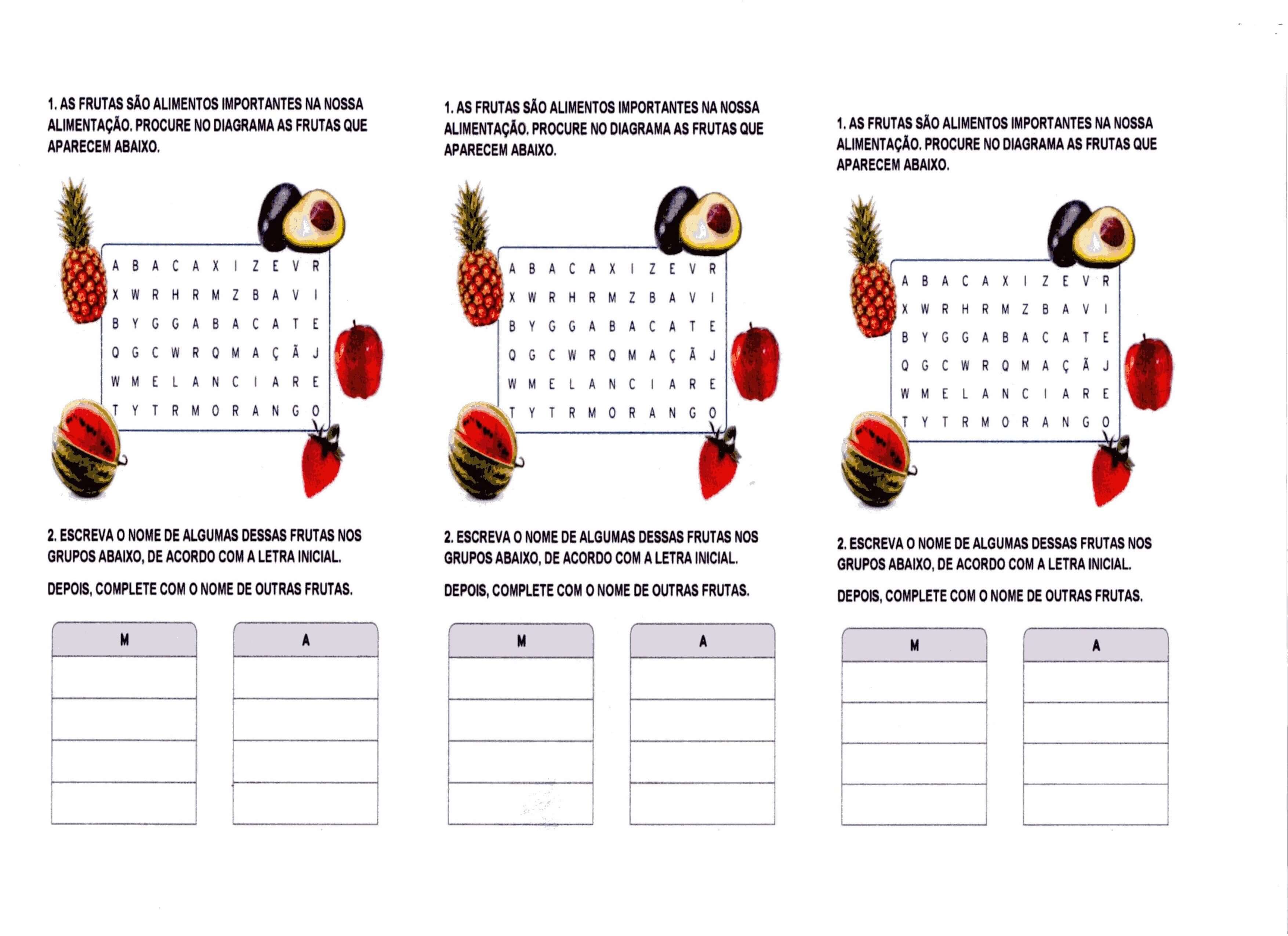 Atividade Frutas-Caça-Palavras-Parte 01. Atividade com frutas que mostra a importância delas na alimentação. É possível fazer caça-palavras, receita e escrita. Esta atividade tem duas partes.