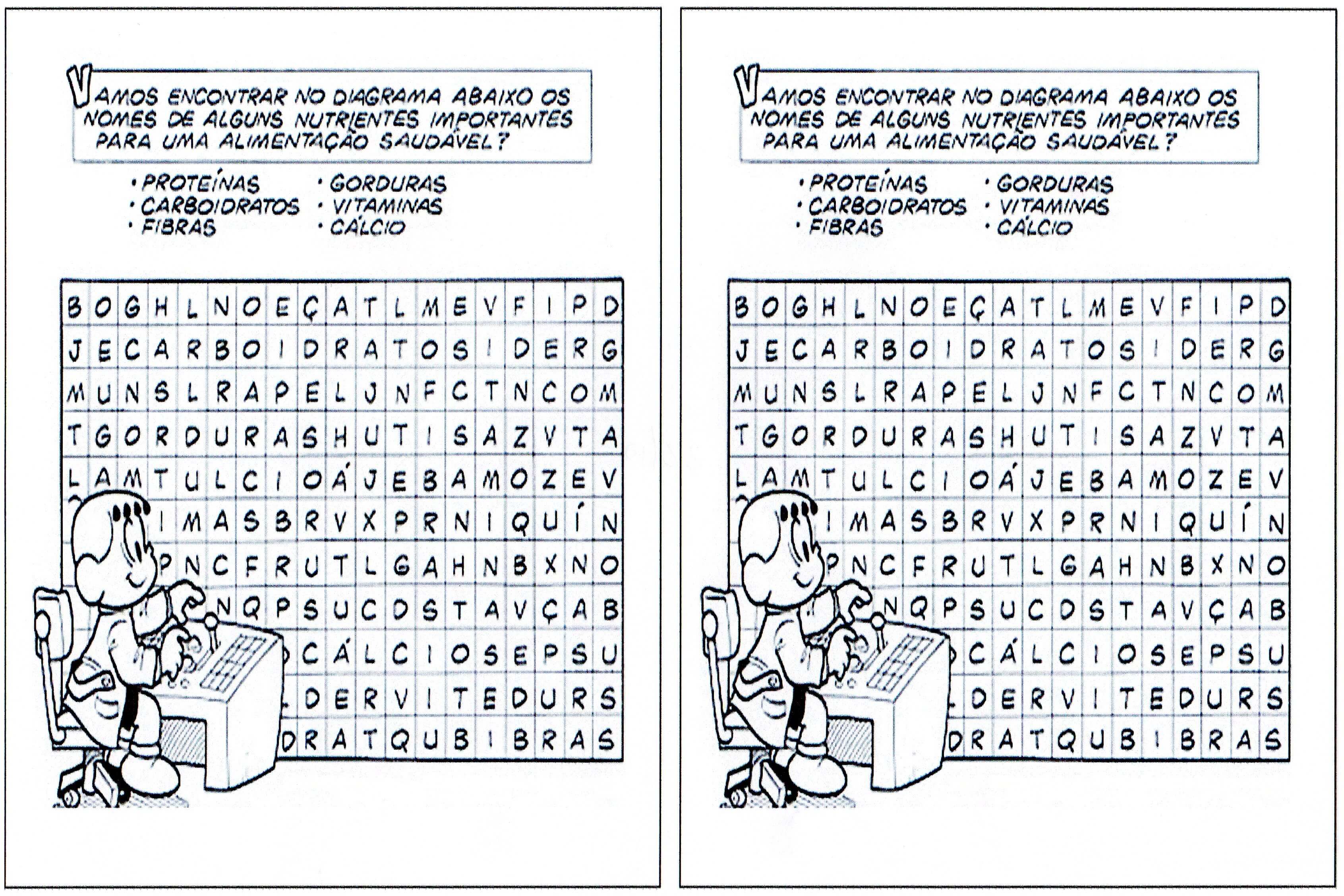 Caça-Palavras Alimentação Saudável é uma atividade que permite encontrar nomes de nutrientes importantes para a alimentação saudável, pronta para imprimir e usar.