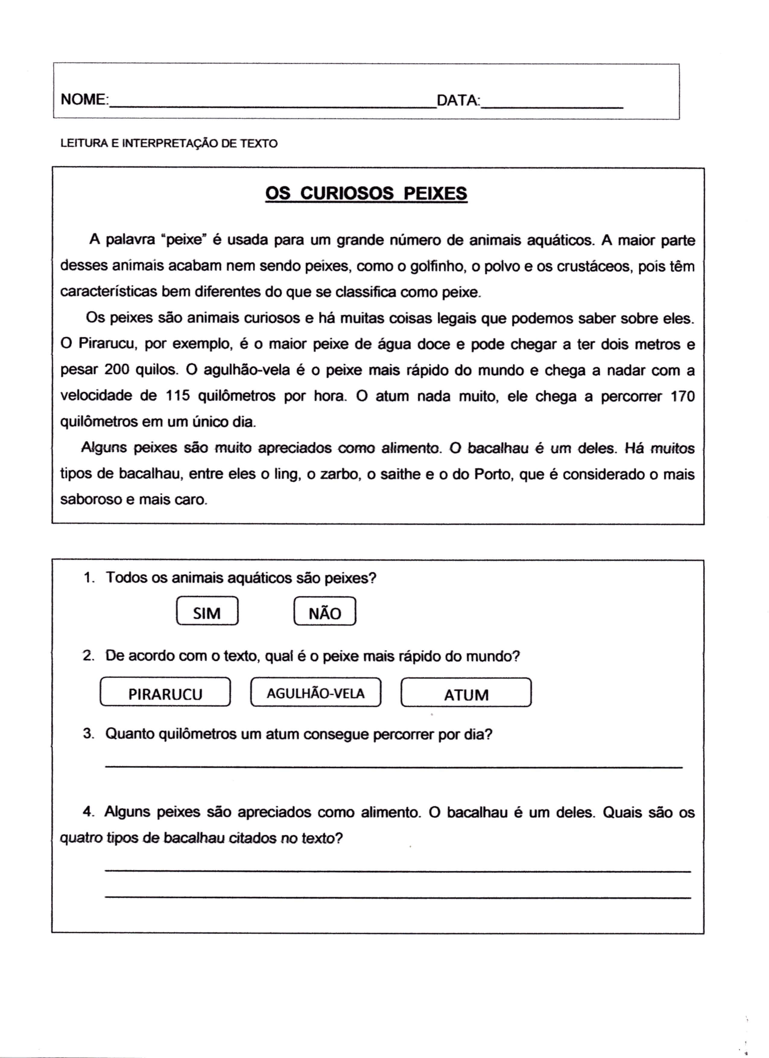 Leitura e Interpretação de texto-Os Curiosos Peixes. Atividade de Interpretação que permite estudar os peixes, seus ambientes e hábitos alimentares.