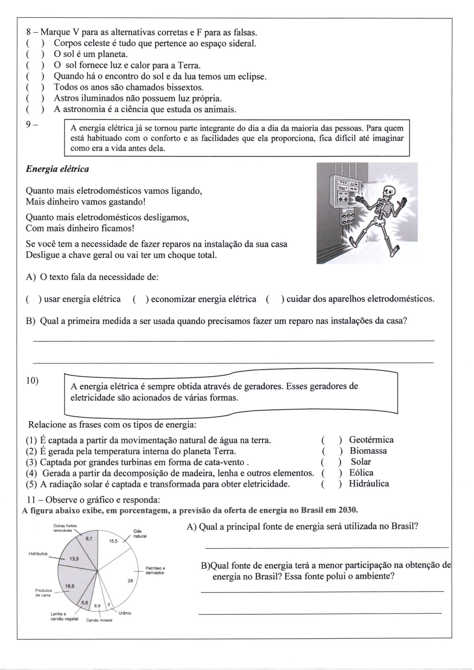 Avaliação 5 Ano-Ciências-Sistema solar e Eletricidade-Parte 2. Avaliação de Ciências dividida em 2 partes, que usa os temas do Sistema solar na primeira parte e da Energia elétrica na segunda parte.