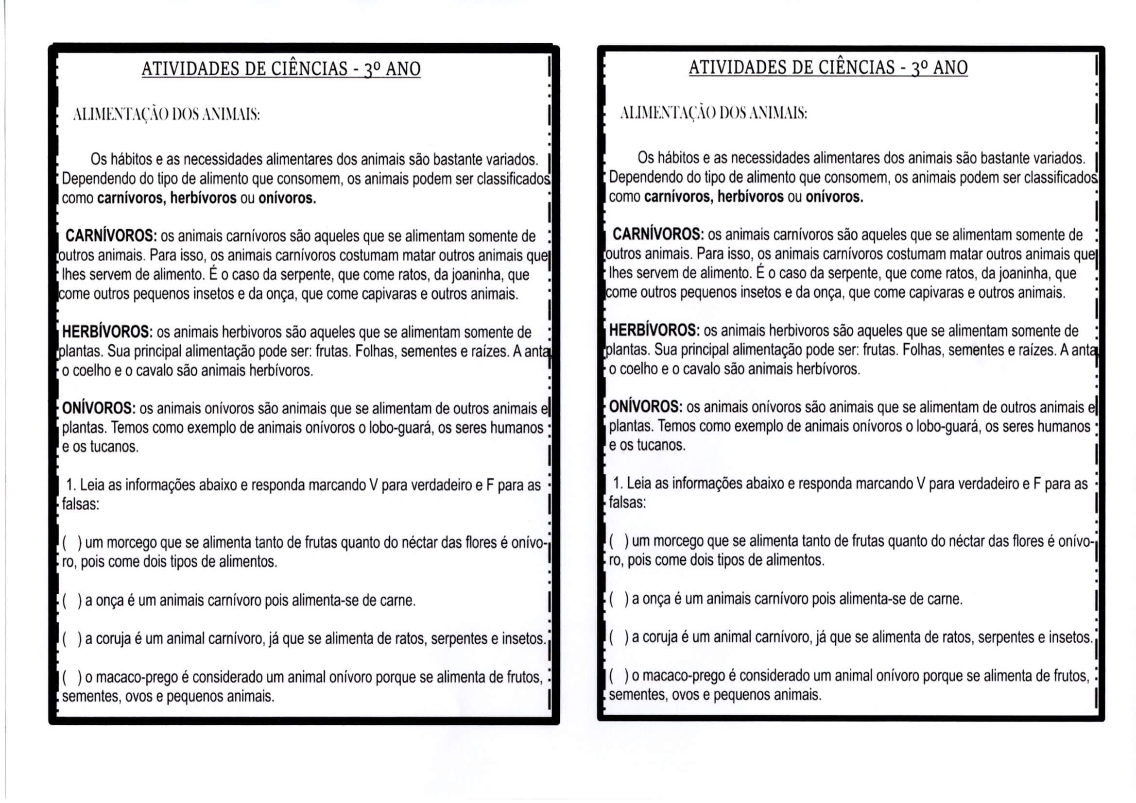 Ciências-Herbívoros Carnívoros e Onívoros. Atividade de Ciências do Ensino Fundamental para trabalhar com os grupos alimentares e sua classificação; Herbívoros Carnívoros e Onívoros.