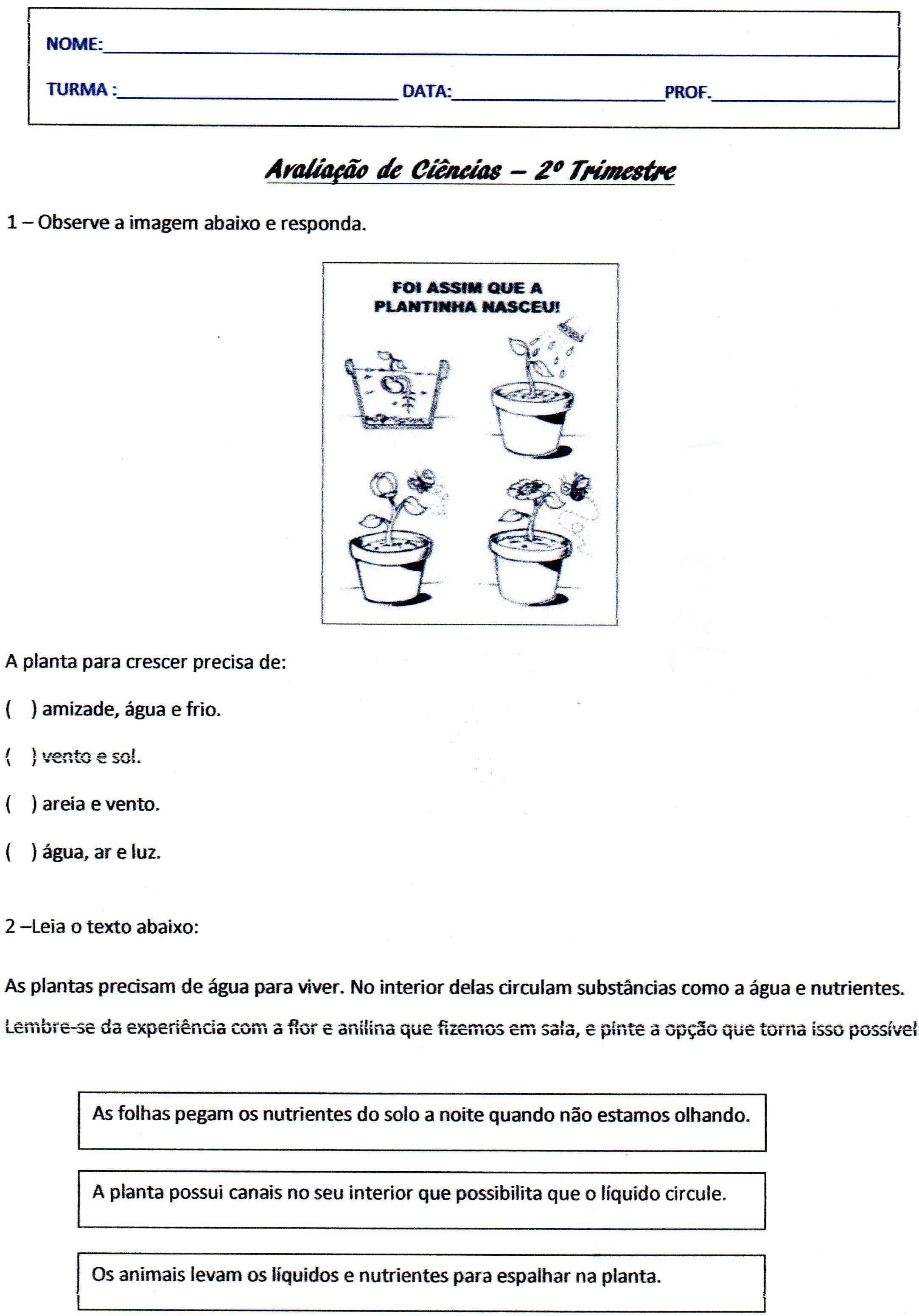 Avaliação Ciências 3 ano 2 trimestre-Parte 2. Avaliação de Ciências do 3º Ano do Ensino Fundamental que envolve seres vivos, plantas, animais, água, solo, reciclagem, poluição e ecologia.