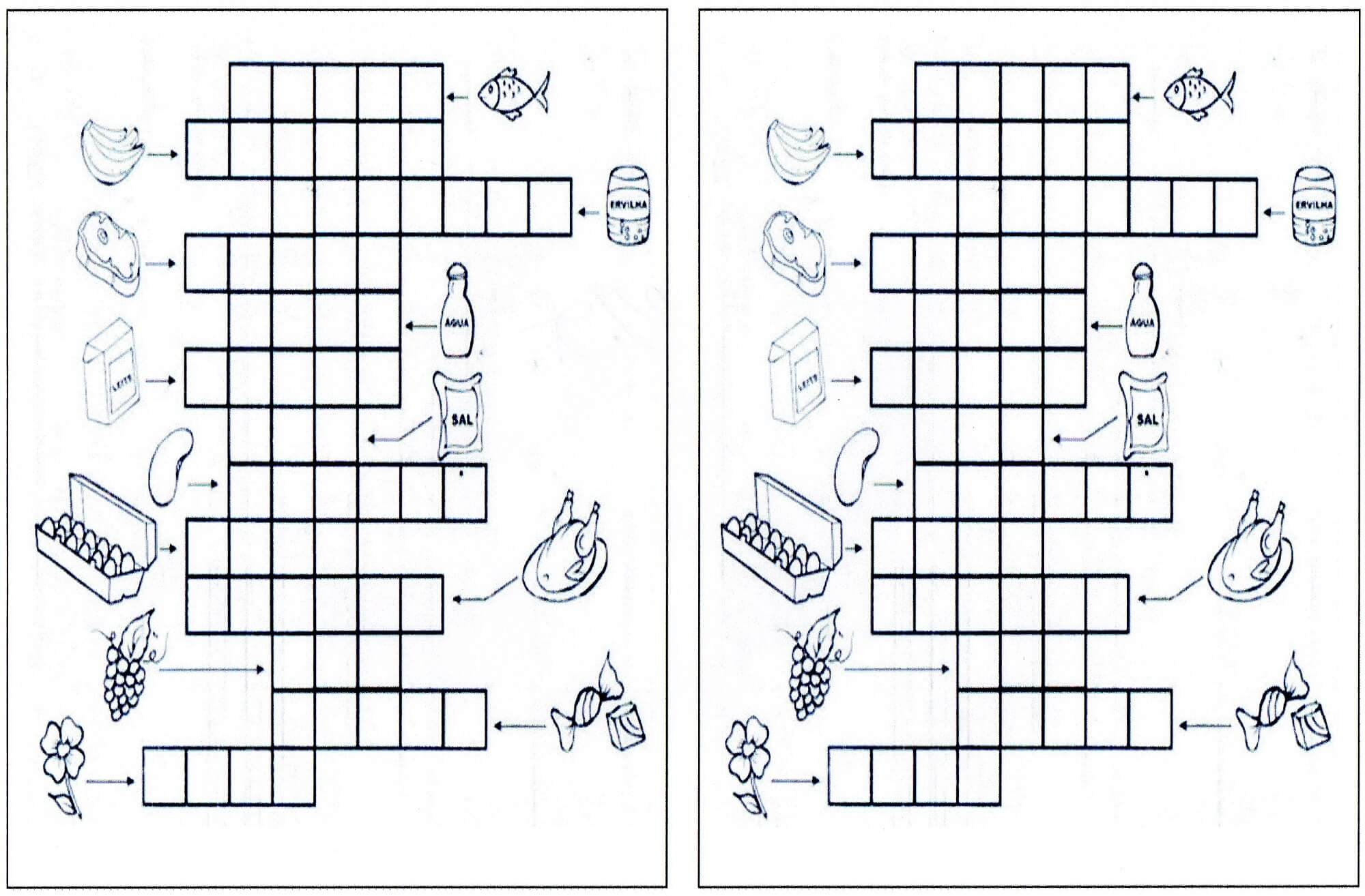 Cruzadinha Alimentos Vegetais Animais Minerais. Com essa cruzadinha simples é possível trabalhar com nomes de alimentos, reinos animal, vegetal e mineral e escrita de palavras.