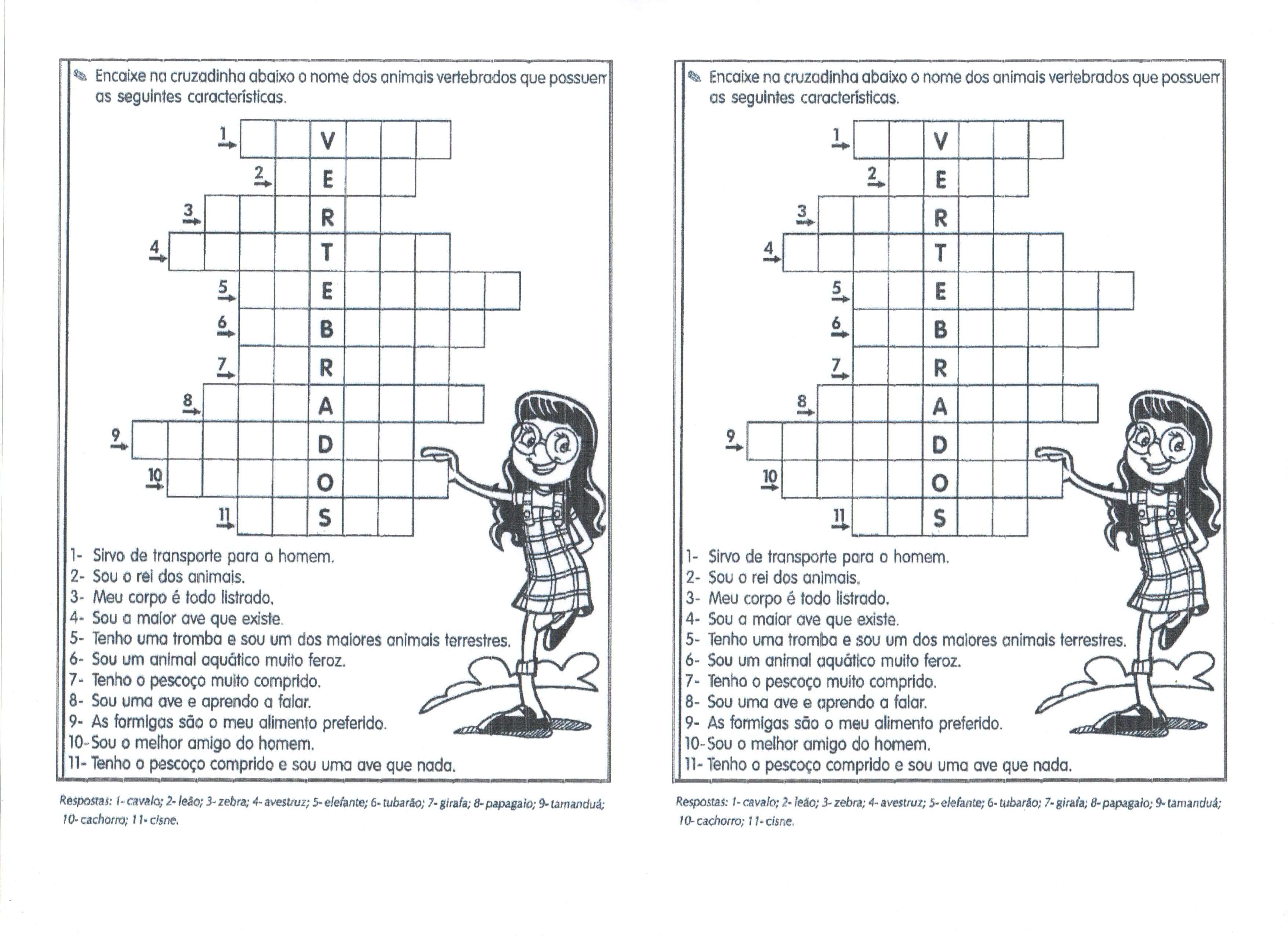 Cruzadinha Animais Vertebrados. Encaixe na cruzadinha os nomes dos animais vertebrados que contam na lista abaixo.