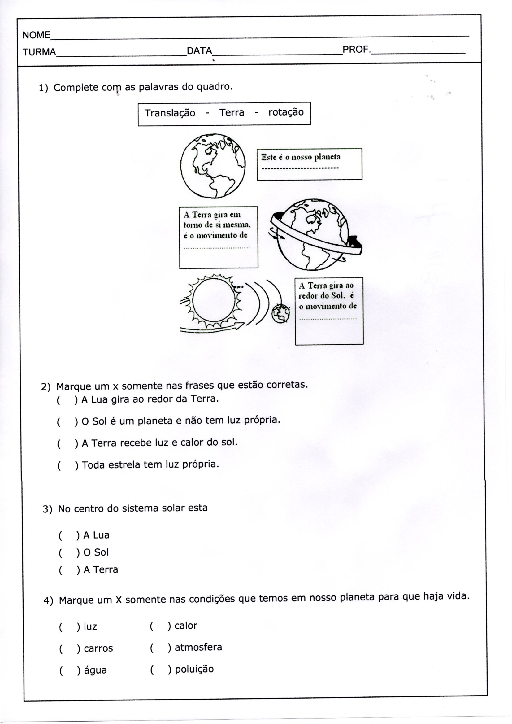 Avaliação de ciências-Sistema solar. Avaliação de Ciências com os temas do Sistema solar, rotação, translação higiene e dengue.