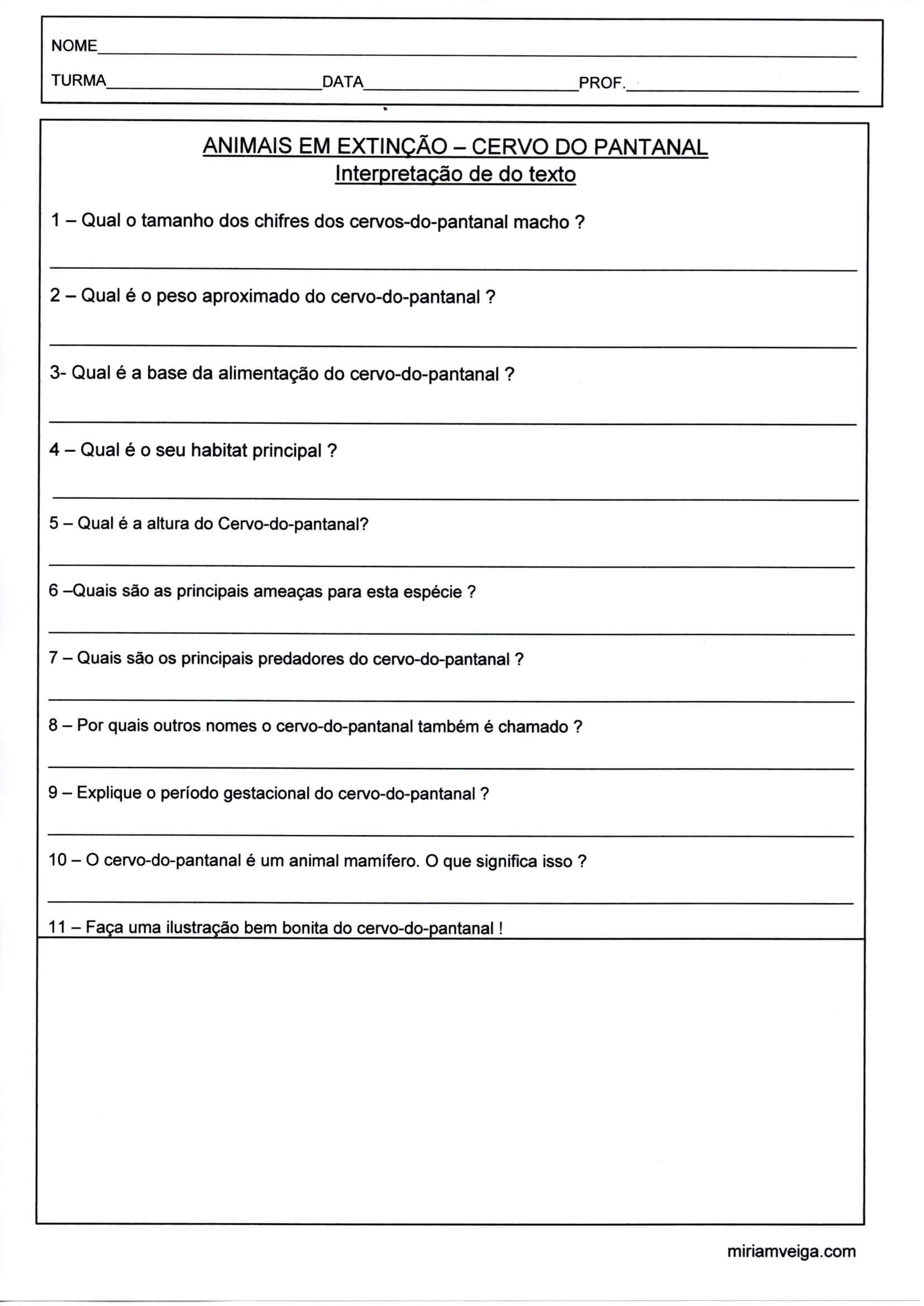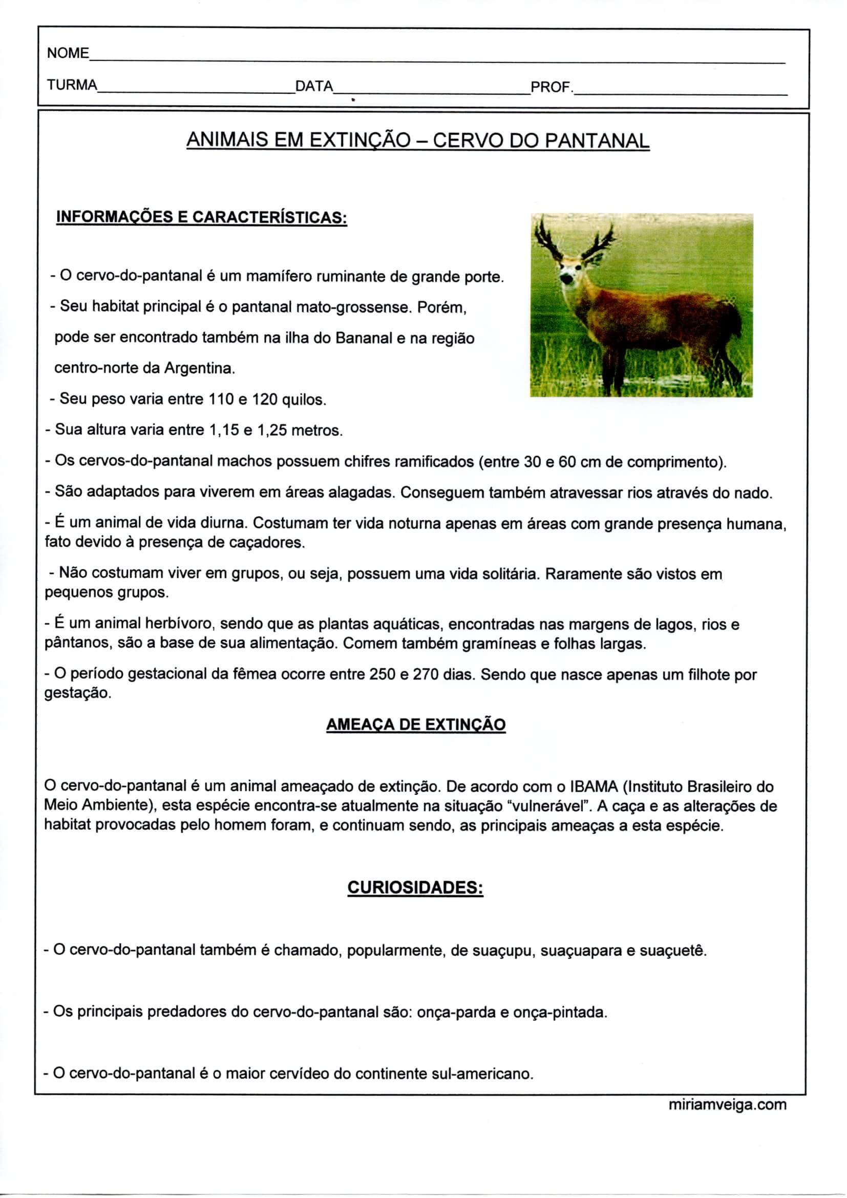 Animais em extinção-Cervo do Pantanal-Parte 2. Atividade de Ciências do Ensino Fundamental com um texto informativo sobre o Cervo do Pantanal para ser lido e interpretado, e com uma folha de questões que virá na parte 2.