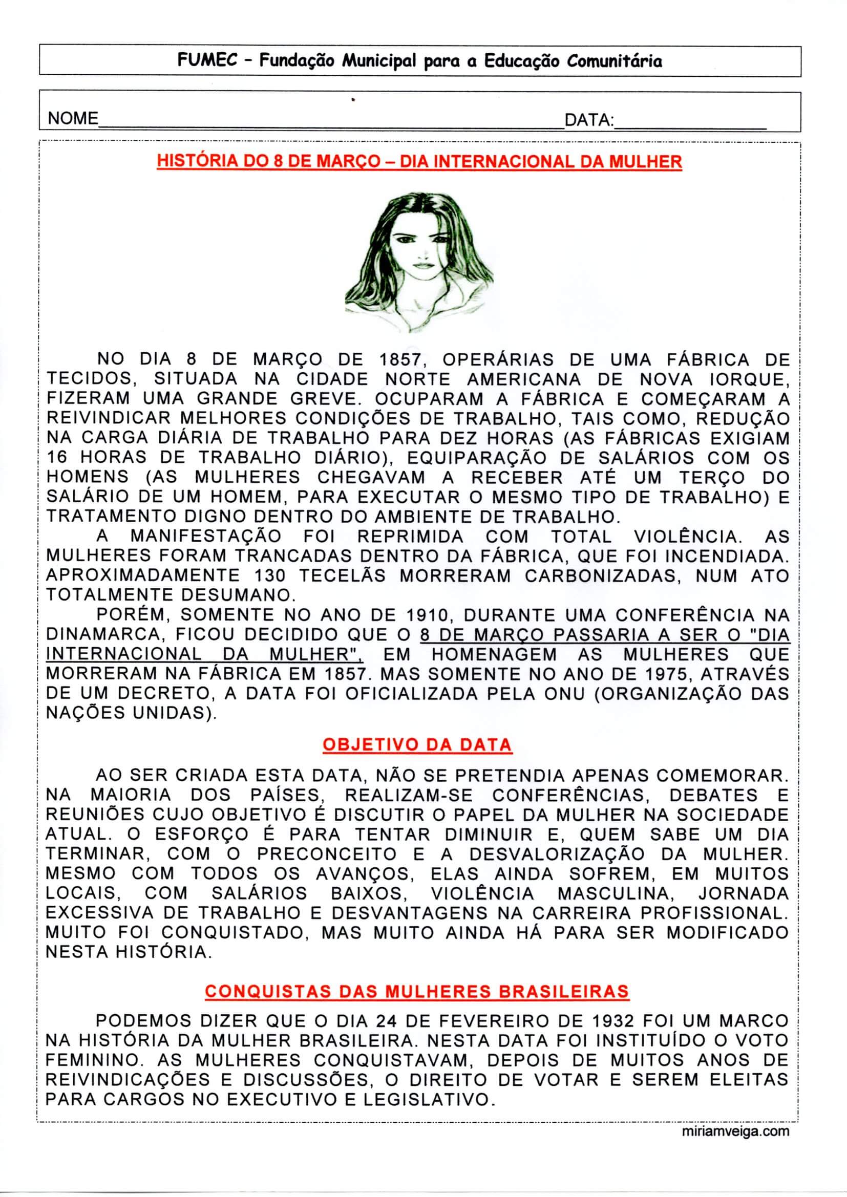 História do 8 de Março-Dia Internacional da Mulher 2. Atividade do Dia Internacional da Mulher com texto de gênero histórico que o aluno deverá ler e depois fazer as atividades da folha 2.