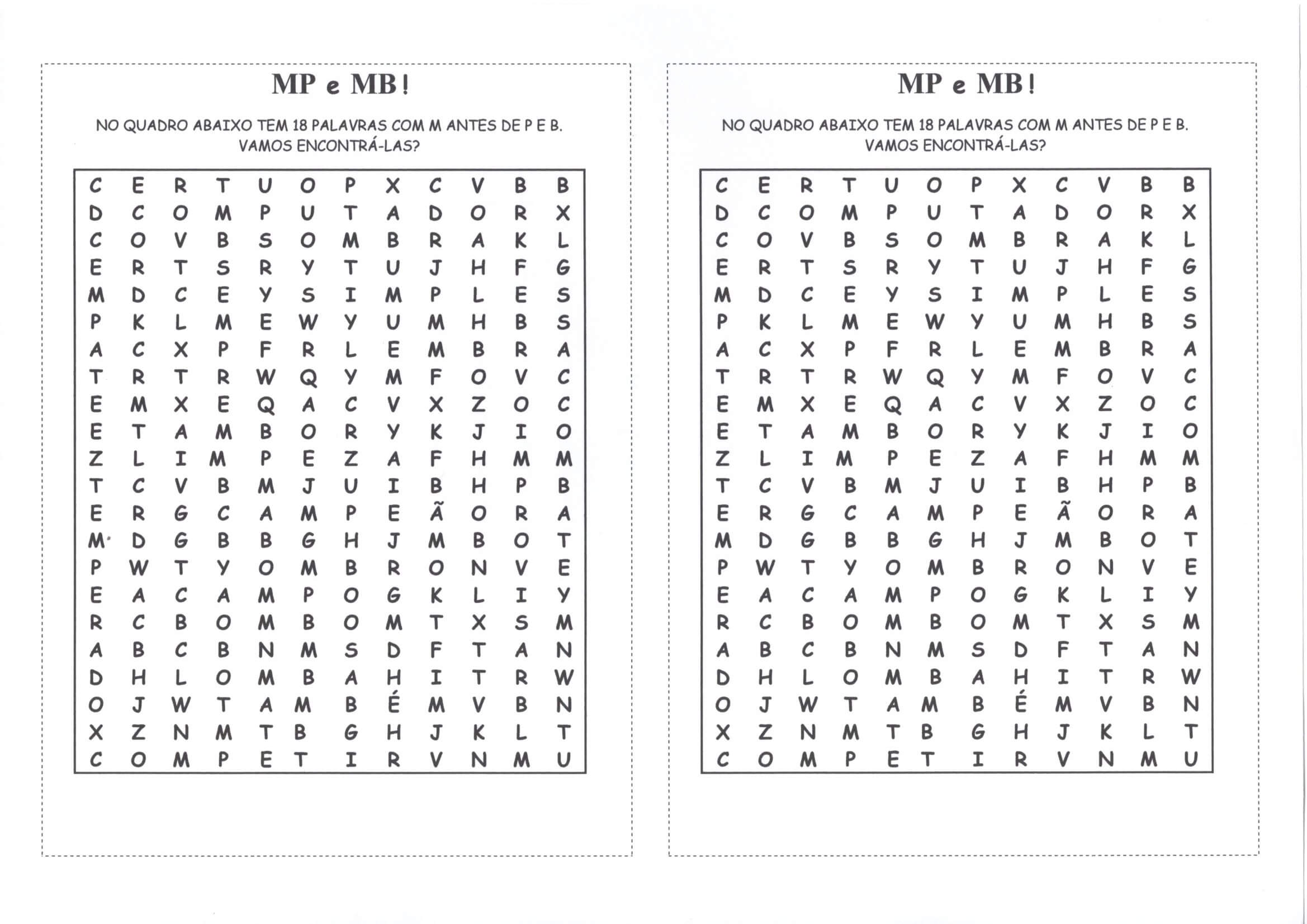 Caça-Palavras-Uso de M antes de P e B. Esta atividade permite Diferenciar o uso do M antes de P e B e procurar no Caça-Palavras os trechos com MP ou MB. Com Gabarito.