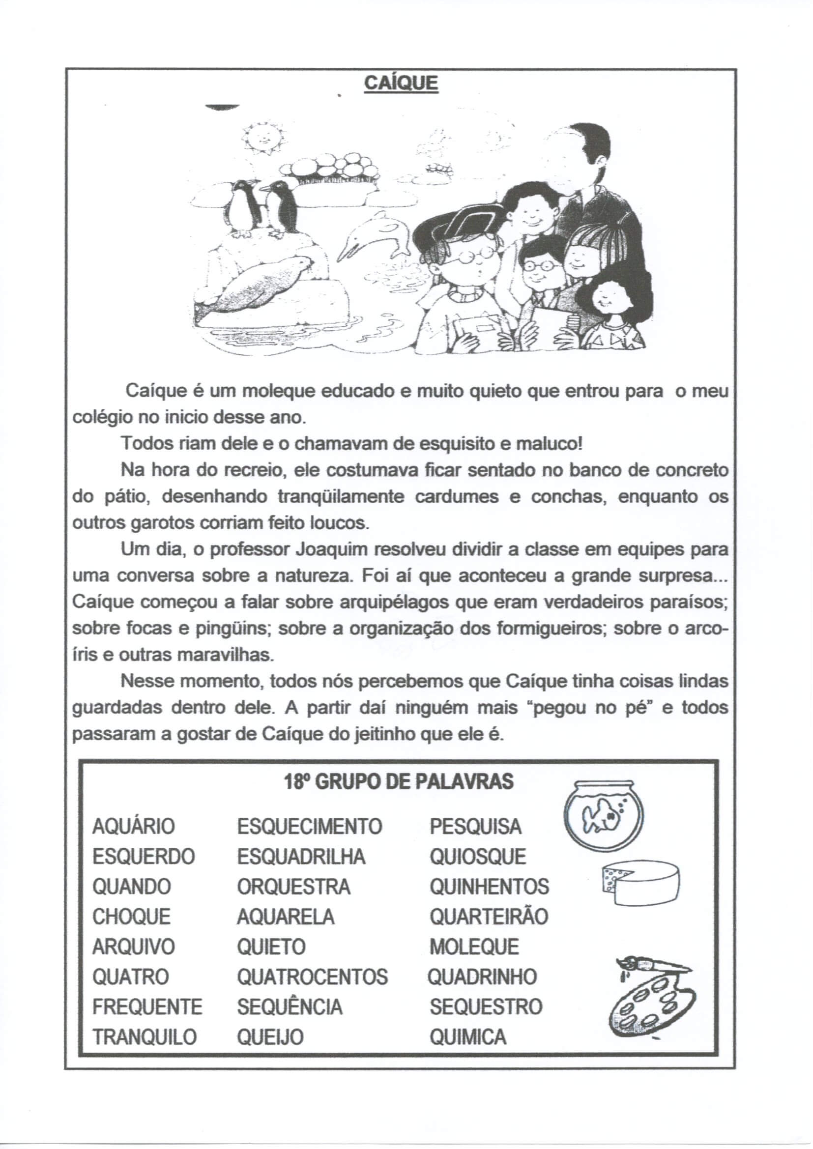 Texto com Dificuldades Ortográficas QUE-QUI. Esta atividade permite trabalhar as Dificuldades Ortográficas QUE-QUI através da leitura do texto e separar os grupos de palavras.