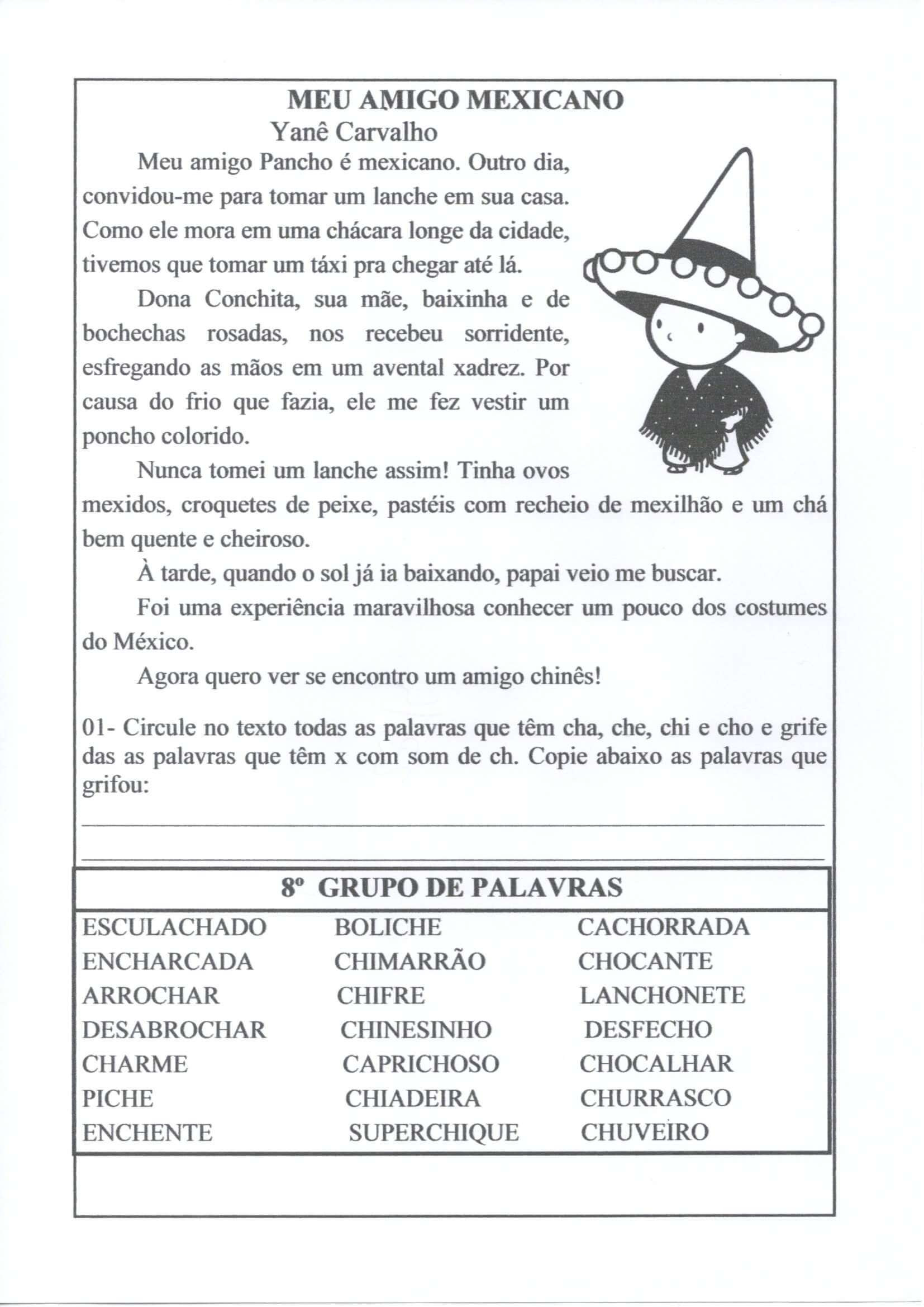 Texto com CH-Meu Amigo Mexicano. Esta atividade permite trabalhar as Dificuldades Ortográficas com CH através da leitura do texto “Meu Amigo Mexicano”, de Yanê Carvalho.