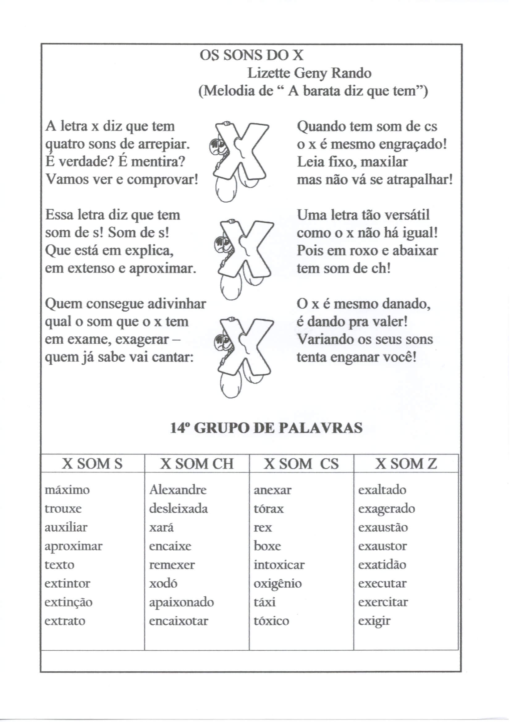 O som das letras-Sons do X-A barata diz que tem. Nesta atividade os alunos precisam ler as frases e perceber as diferenças entre os diversos sons da letra “X”.