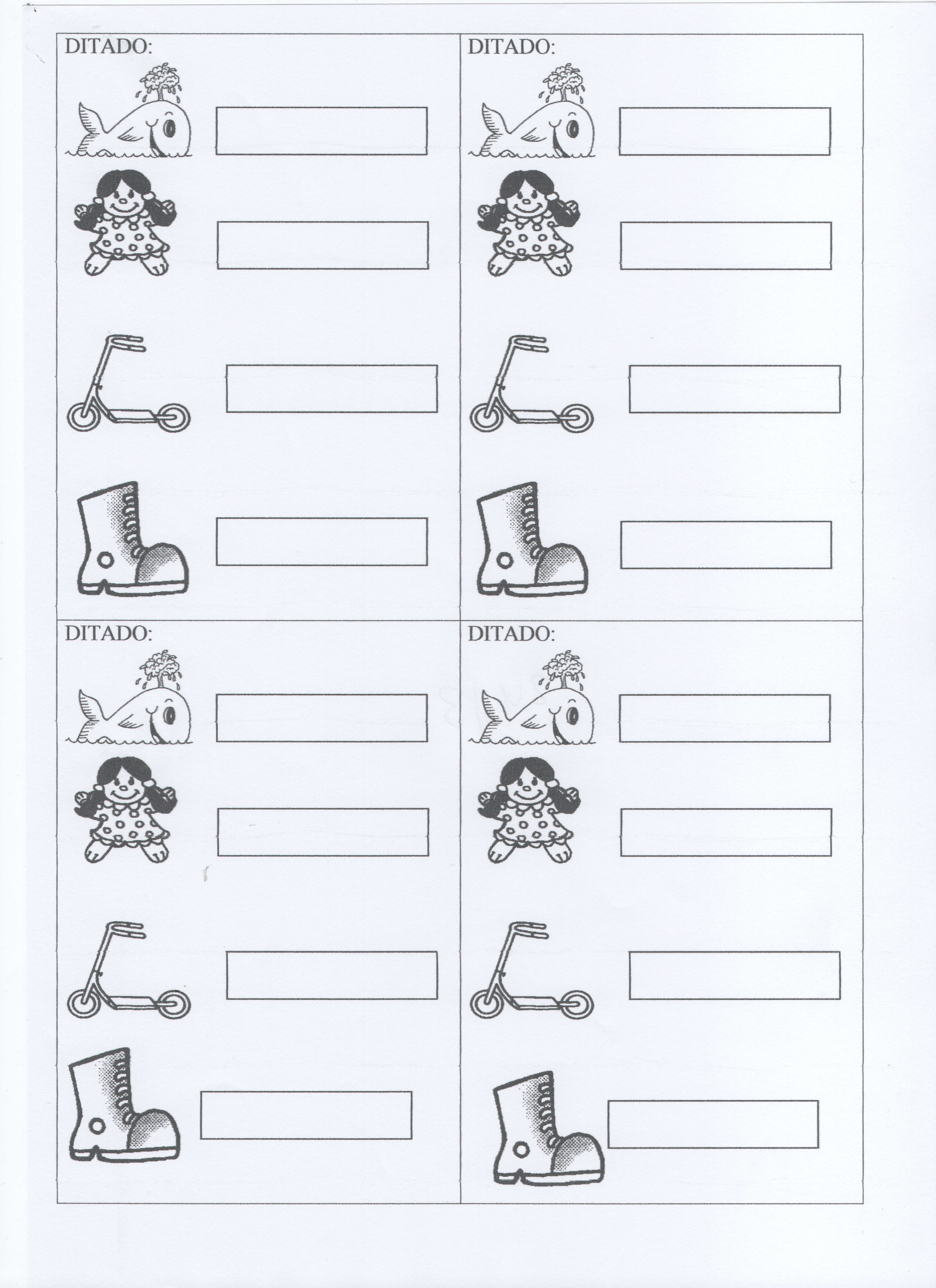 Ditadinhos 1 e 2. Atividade de ditado com lista de figuras para ditar e escrever, para Ensino Fundamental.