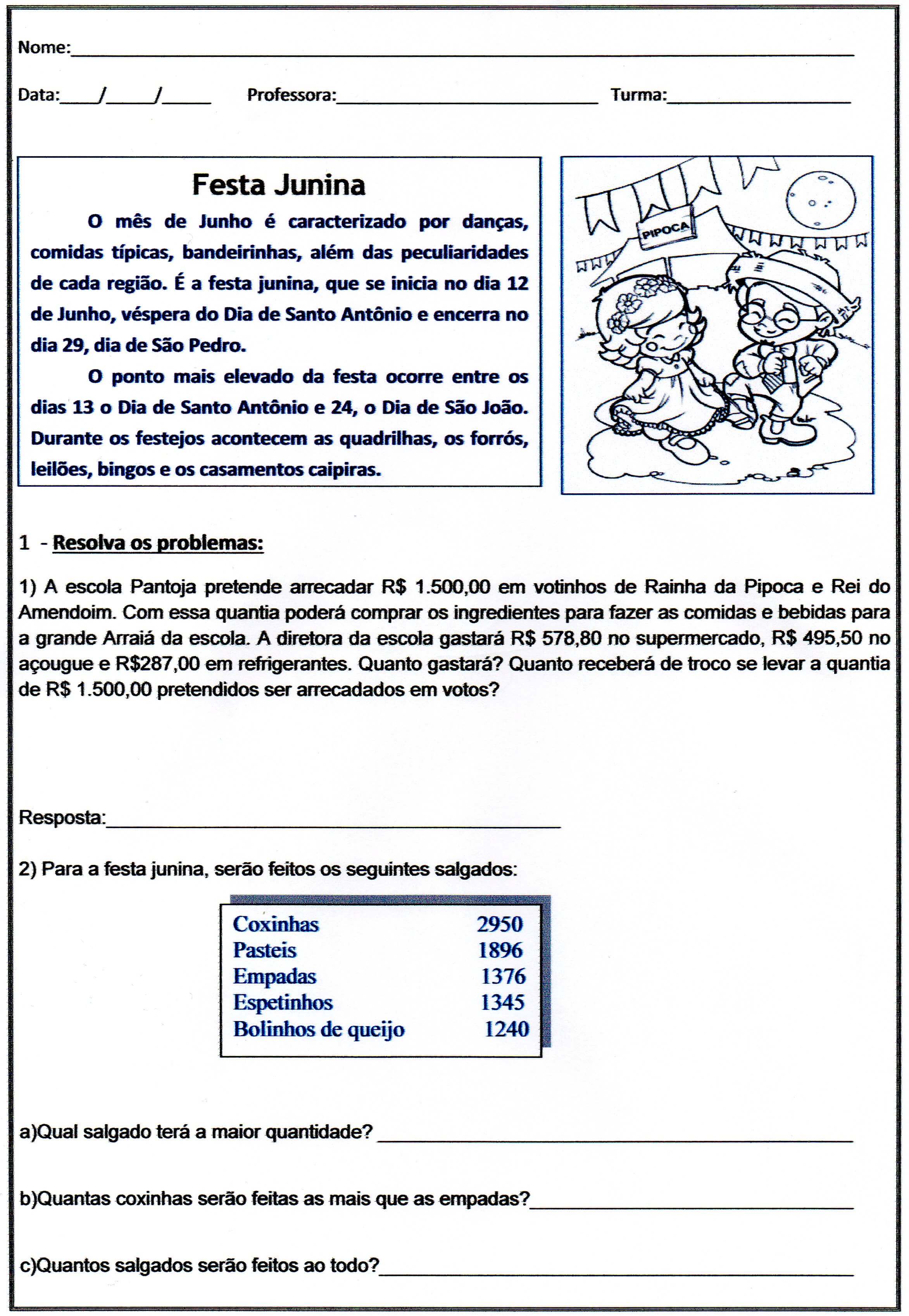 Festa Junina Problemas. Atividades com o tema Festa Junina divididas em 6 partes que sairão em sequência, usando o Tema das Festas Juninas e Quermesses para Interpretação de textos, fazer Cálculos, Cruzadinhas, Listas, Sílabas e Ditado. Esta é a parte 01.