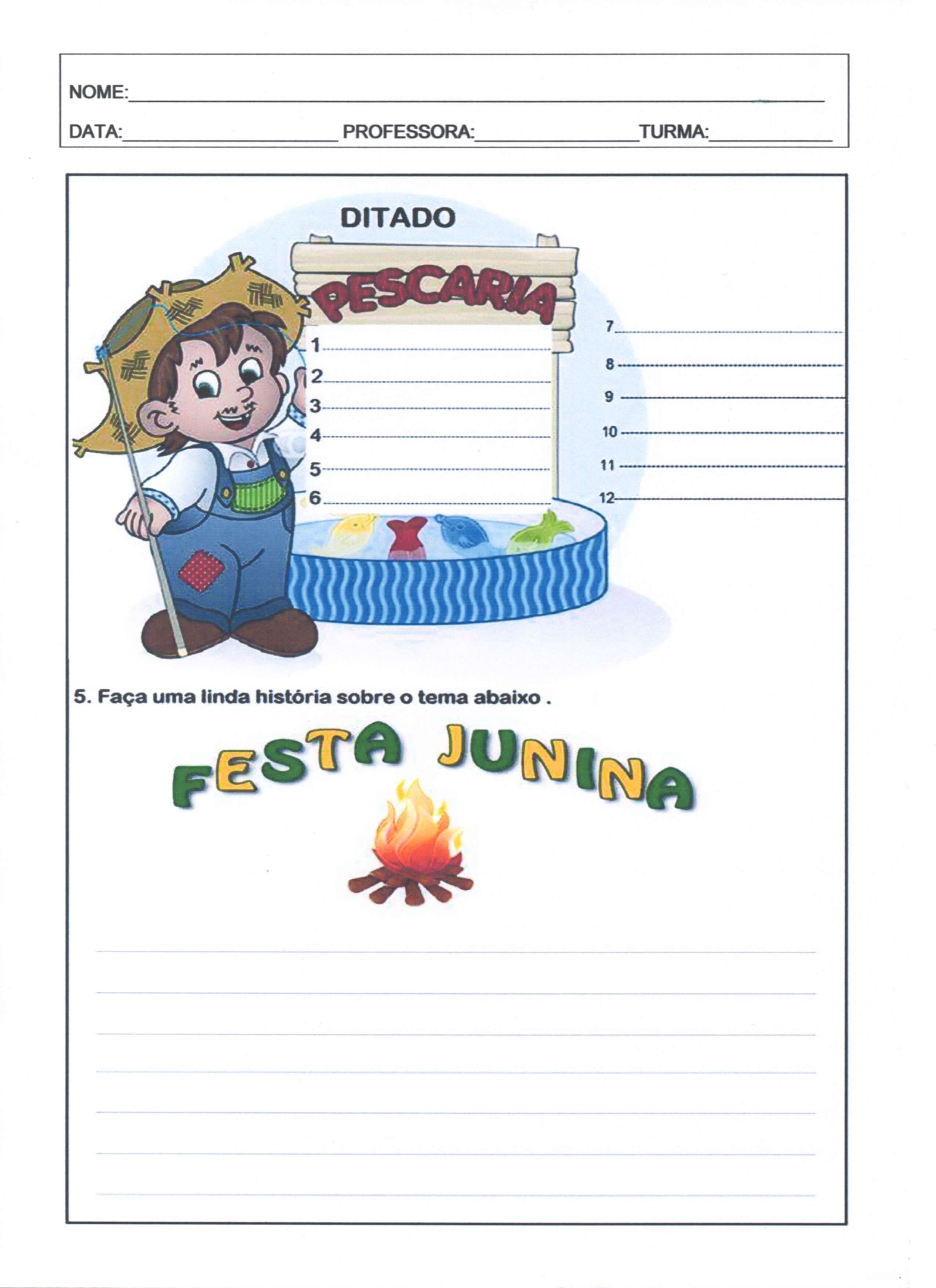 Festa Junina Leitura e Interpretação 1. Atividades com o tema Festa Junina divididas em 6 partes que sairão em sequência, usando o Tema das Festas Juninas e Quermesses para Interpretação de textos, fazer Cálculos, Cruzadinhas, Listas, Sílabas e Ditado. Esta é a parte 05.