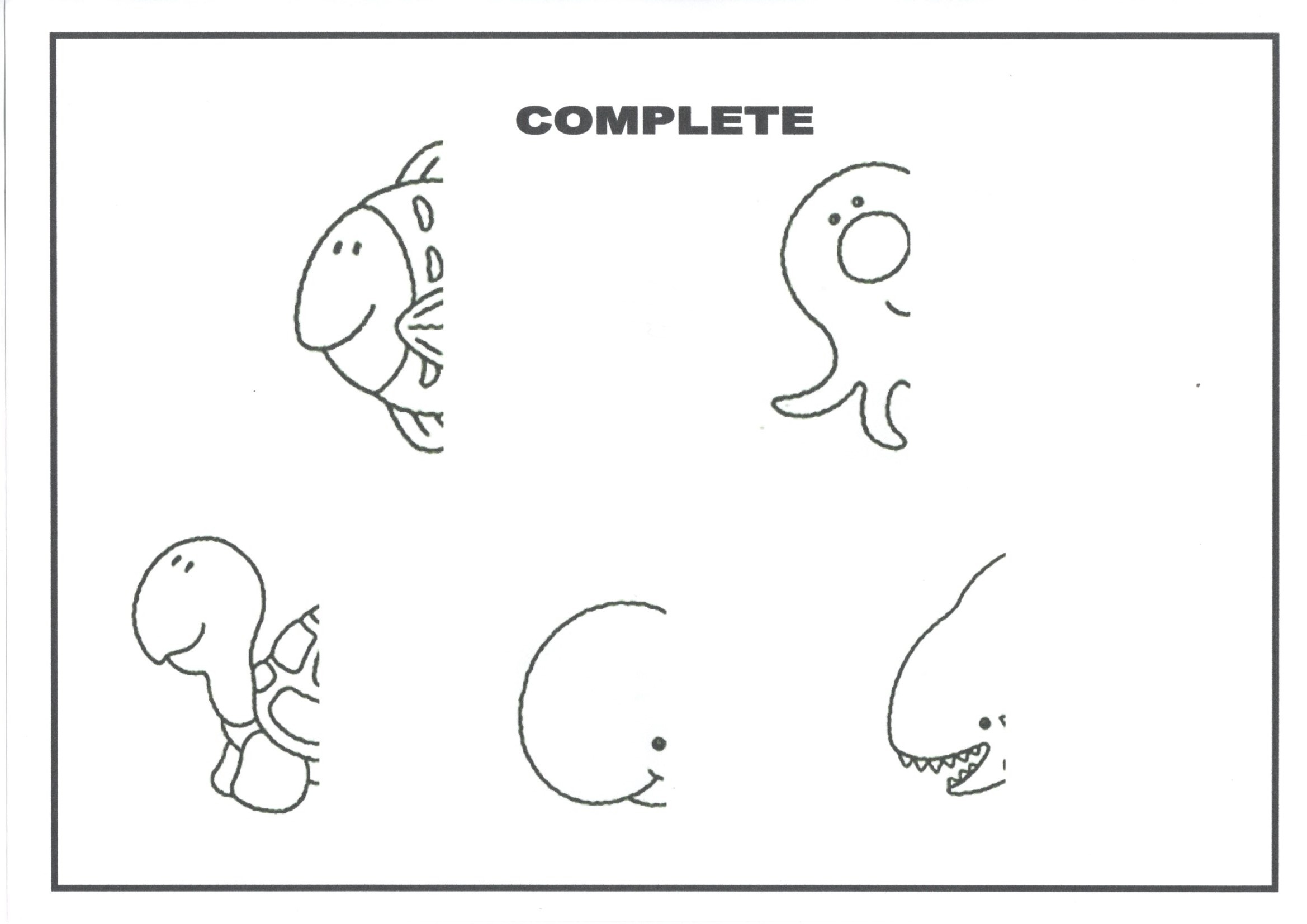 Educação Infantil-Encontre o que falta e complete. Atividade para recortar, encontrar, colar, completar e pintar as figuras dos animais e das crianças com suas mochilas.
