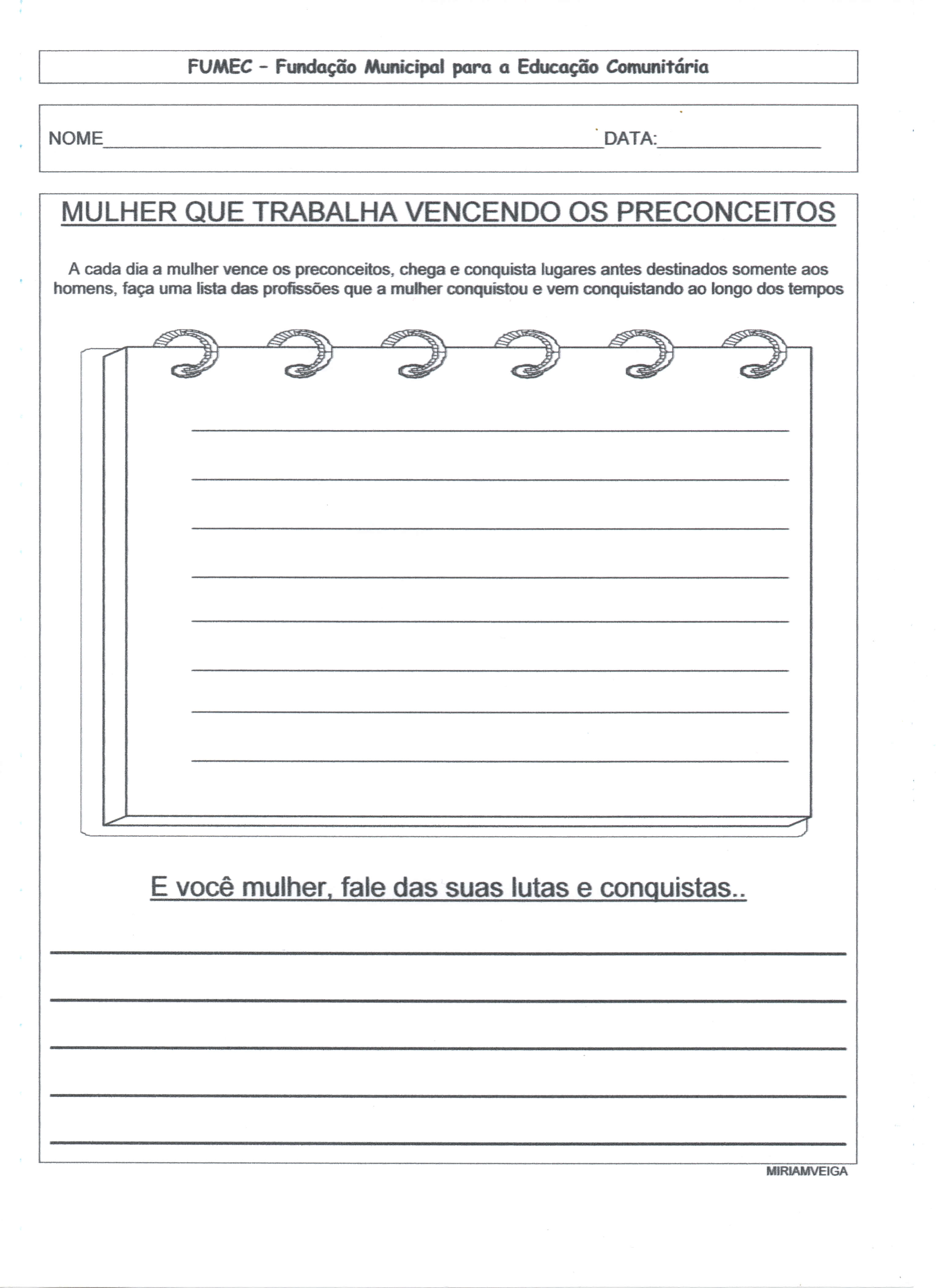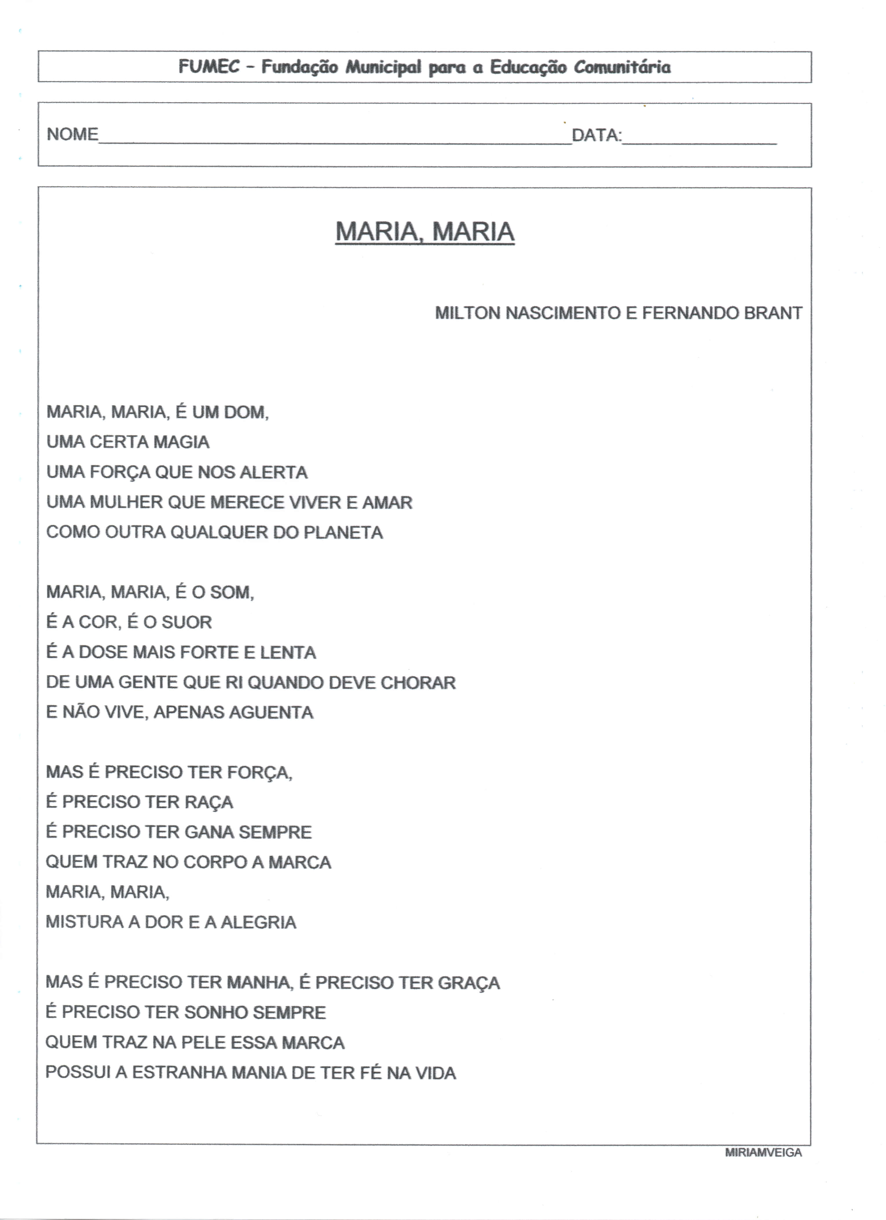 …Dia Internacional da Mulher-Maria Maria-Parte 2 EJA. Atividade sobre o Dia Internacional da Mulher dividida em 2 partes que utiliza a música Maria, Maria, de – Milton Nascimento. A partir da letra usa-se os recortes, montagem da letra recortada, fala do trabalho, preconceitos, usa um acróstico com a palavra MULHER e tem uma capa para a atividade que os alunos deverão preencher.