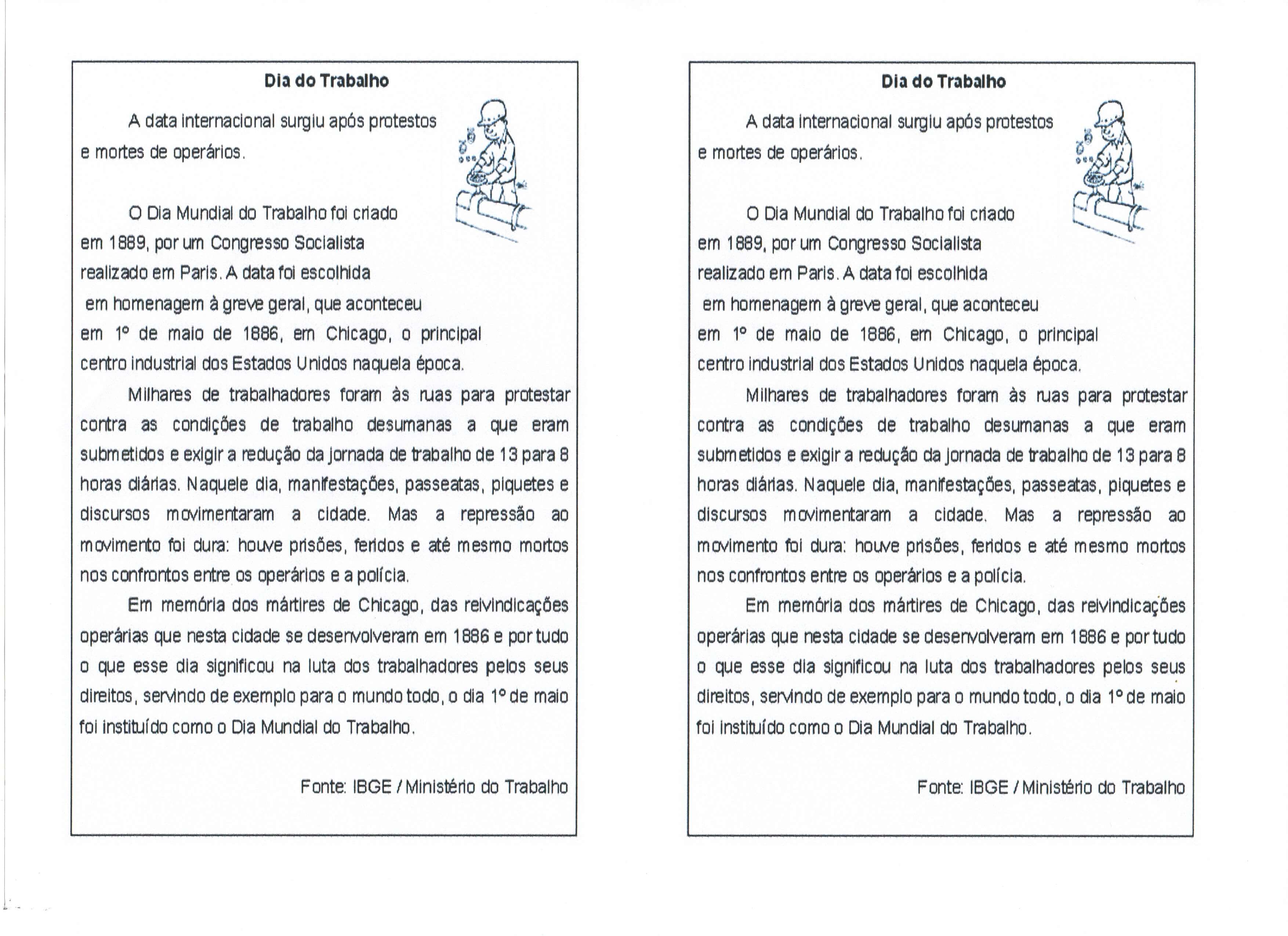 …Dia Internacional do Trabalho-Parte 3. Esta atividade sobre o Dia Internacional do Trabalho fala sobre a história da data, usando alfabeto, cruzadinha, abecedário das profissões, confecção de lista, recorte e cole em ordem.