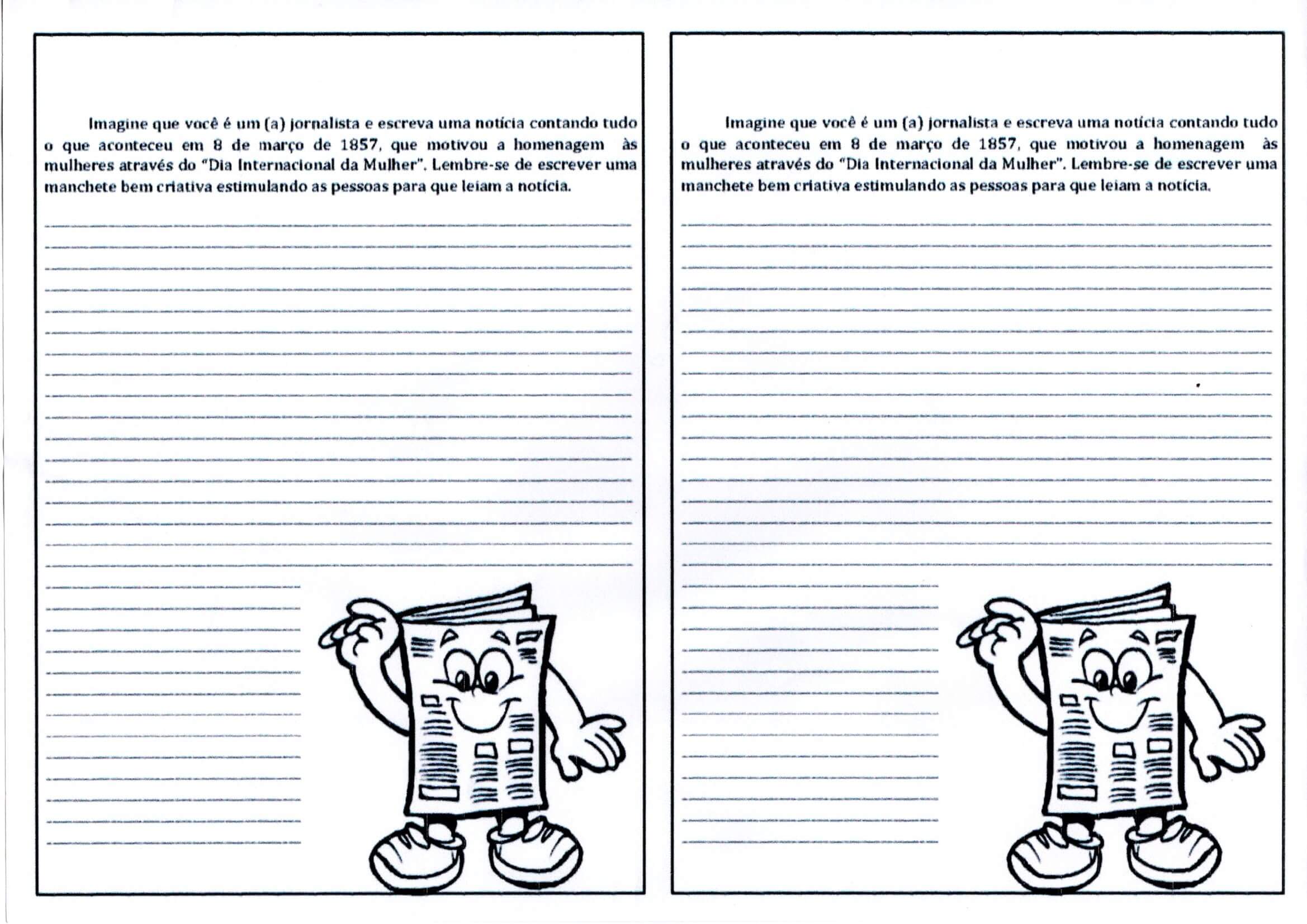 Texto jornalístico-Dia Internacional da Mulher. Atividade do Dia Internacional da Mulher com texto de gênero jornalístico na qual o aluno deverá escrever um texto contando sobre o Dia Internacional da Mulher, porque existe esta homenagem e motivando as pessoas a lerem a história.