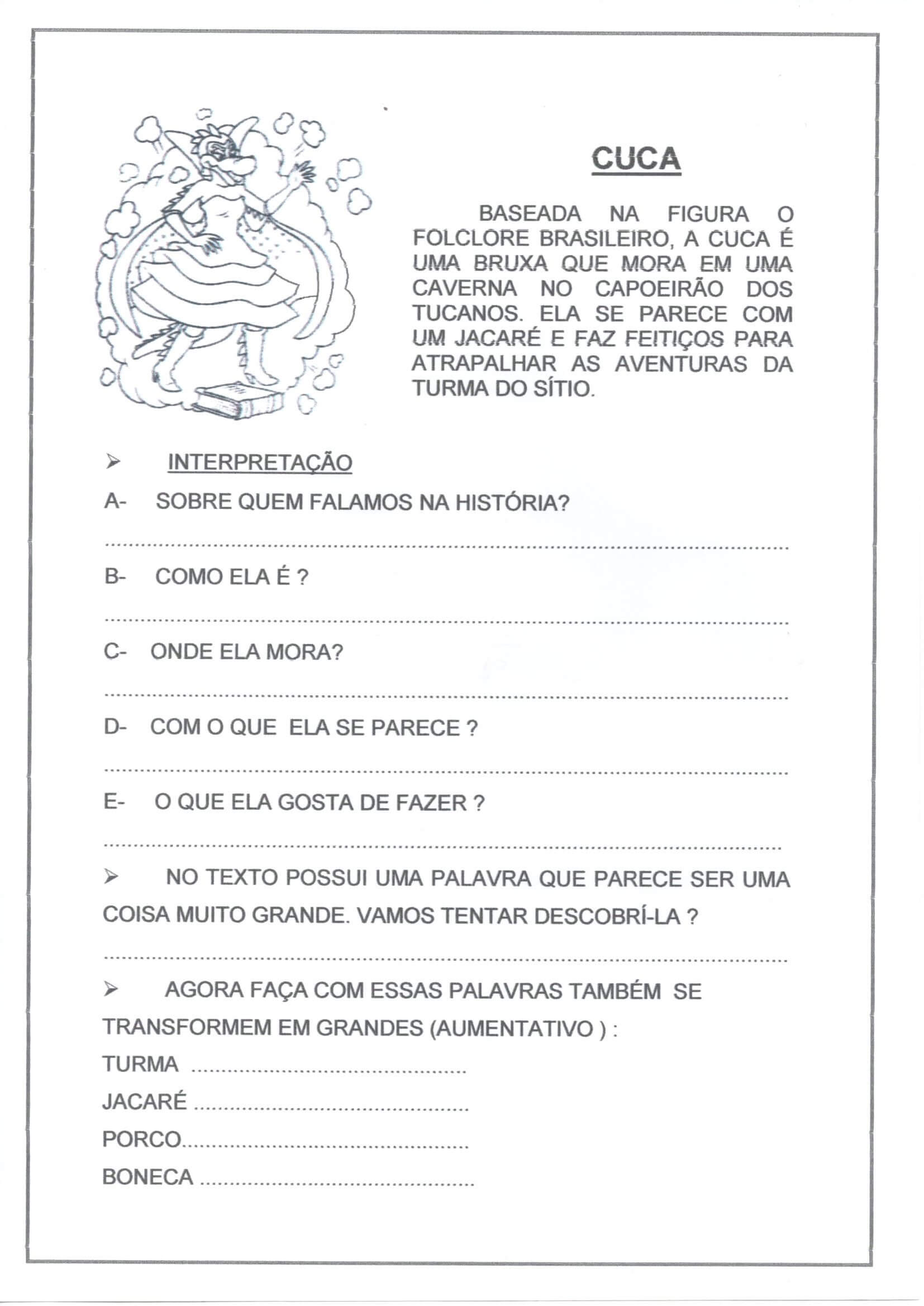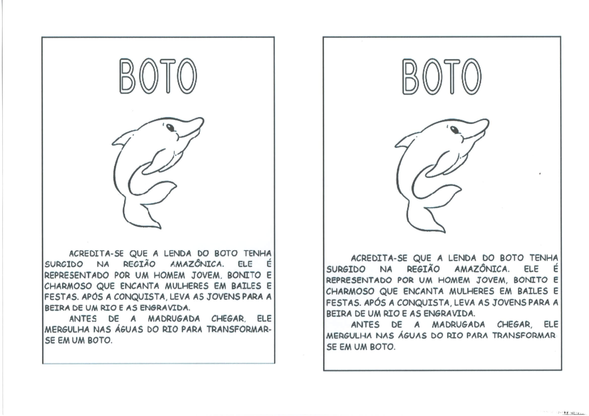 Personagens do Folclore-Boto Boitatá e Curupira. Esta atividade com o Tema folclórico permite formar um Álbum com capa, trabalhar com os personagens Boto, Boitatá e Curupira, cada um a partir de um texto.