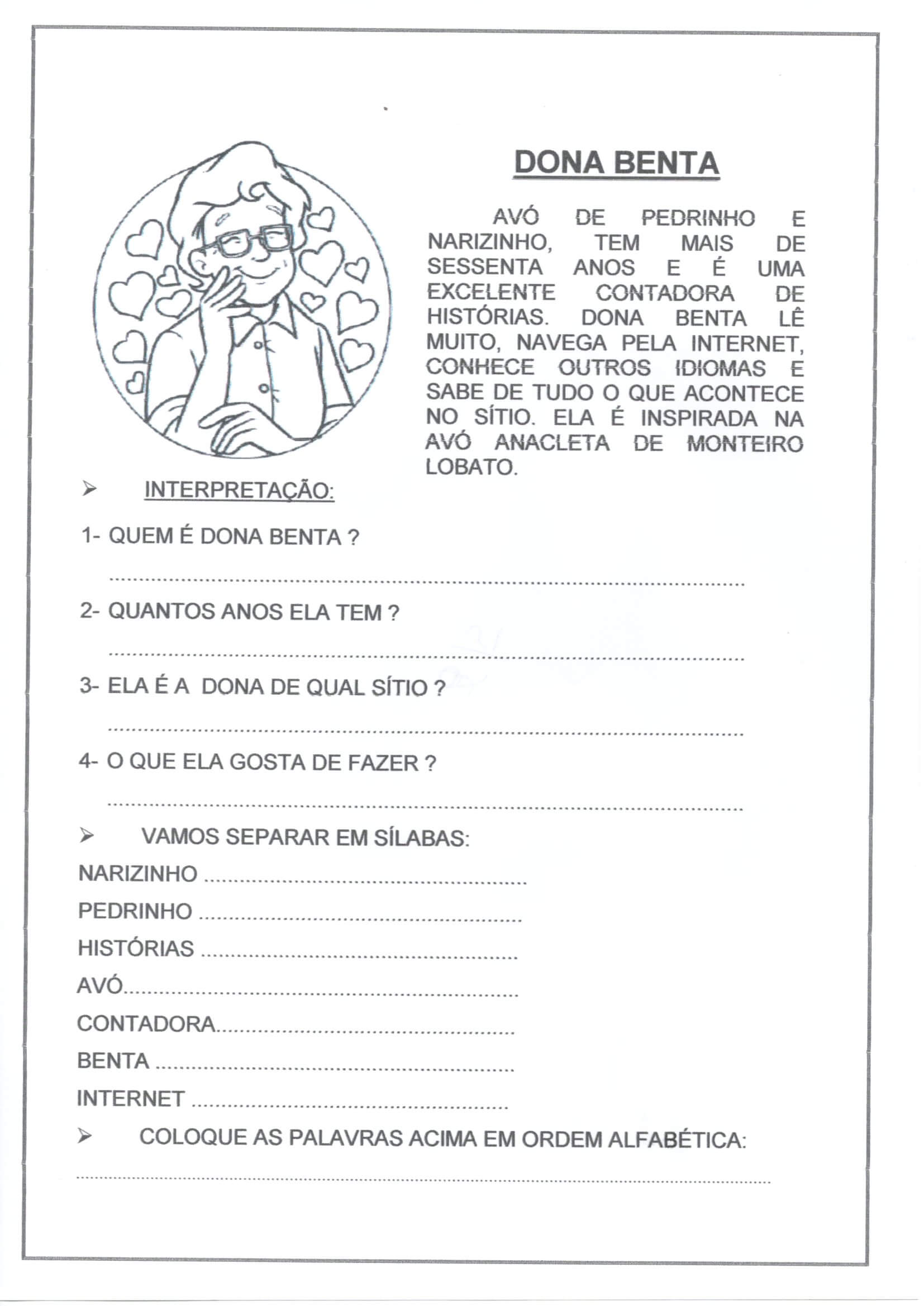 …Projeto Sítio do Pica-Pau Amarelo-Parte 13. Projeto de trabalho com o tema do Sítio do Pica-Pau Amarelo, abordando as histórias do sítio, o autor e seus personagens, interpretação, escrita, gráfico, palavras-cruzadas, músicas, gênero textual, aumentativo, diminutivo, sílabas.