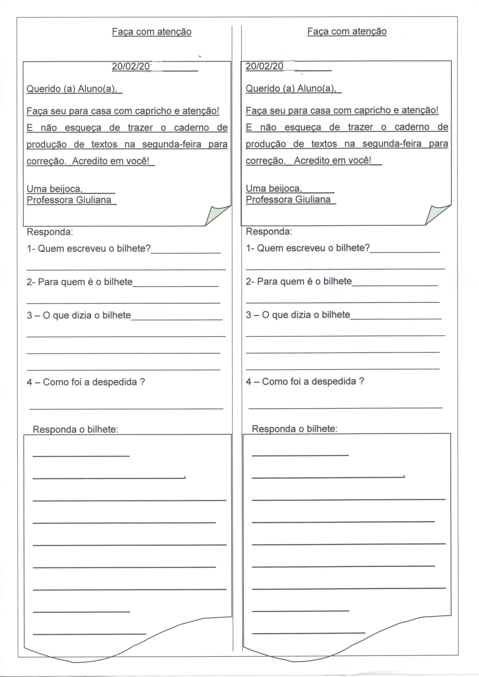 Trabalhando com Bilhete-Resposta. Atividade de estudo de Bilhete, leitura, interpretação e produção de resposta. Cada folha dá pra 3 alunos.