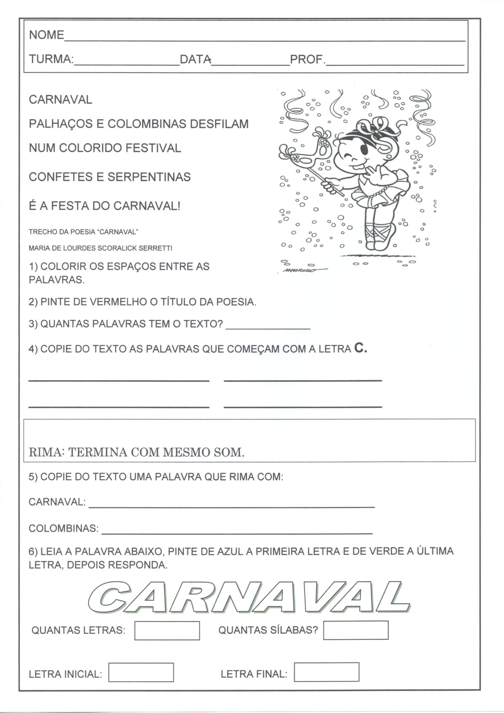 CARNAVAL-Letra Silaba Letra Inicial e Final. Atividade com Tema de Carnaval para trabalhar, interpretação, rimas, letras, símbolos, letra inicial e letra final.